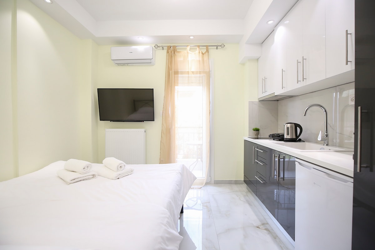 Stylish, just renovated studio only 10 minutes from the city center of Thessaloniki Smart, expert design, with island vibes, a true oasis in the middle of the city. Fully equipped kitchen, Nespresso machine, gas heating, high speed optic fiber internet with up to 300MBps, netflix account. Ideal for business travellers and sightseers. Welcome and enjoy your stay!