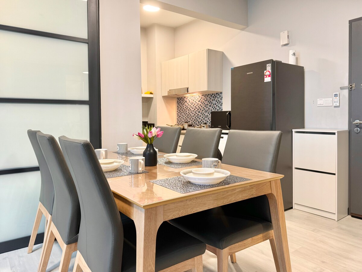 Nuevo apartamento ubicado en el distrito financiero y junto a la bahía marítima. Disfruta de vistas al mar rodeadas de islas en nuestra unidad de piso alto. A poca distancia a pie de Jetty, con comodidad para ir de isla en isla; el centro de convenciones internacional, el centro comercial Jesselton (Duty Free) y el centro comercial Suria Sabah están cerca. Nuestra suite es limpia, con desinfección frecuente y purificador de aire. Ideal para familias y también adecuado para parejas y viajes de negocios.