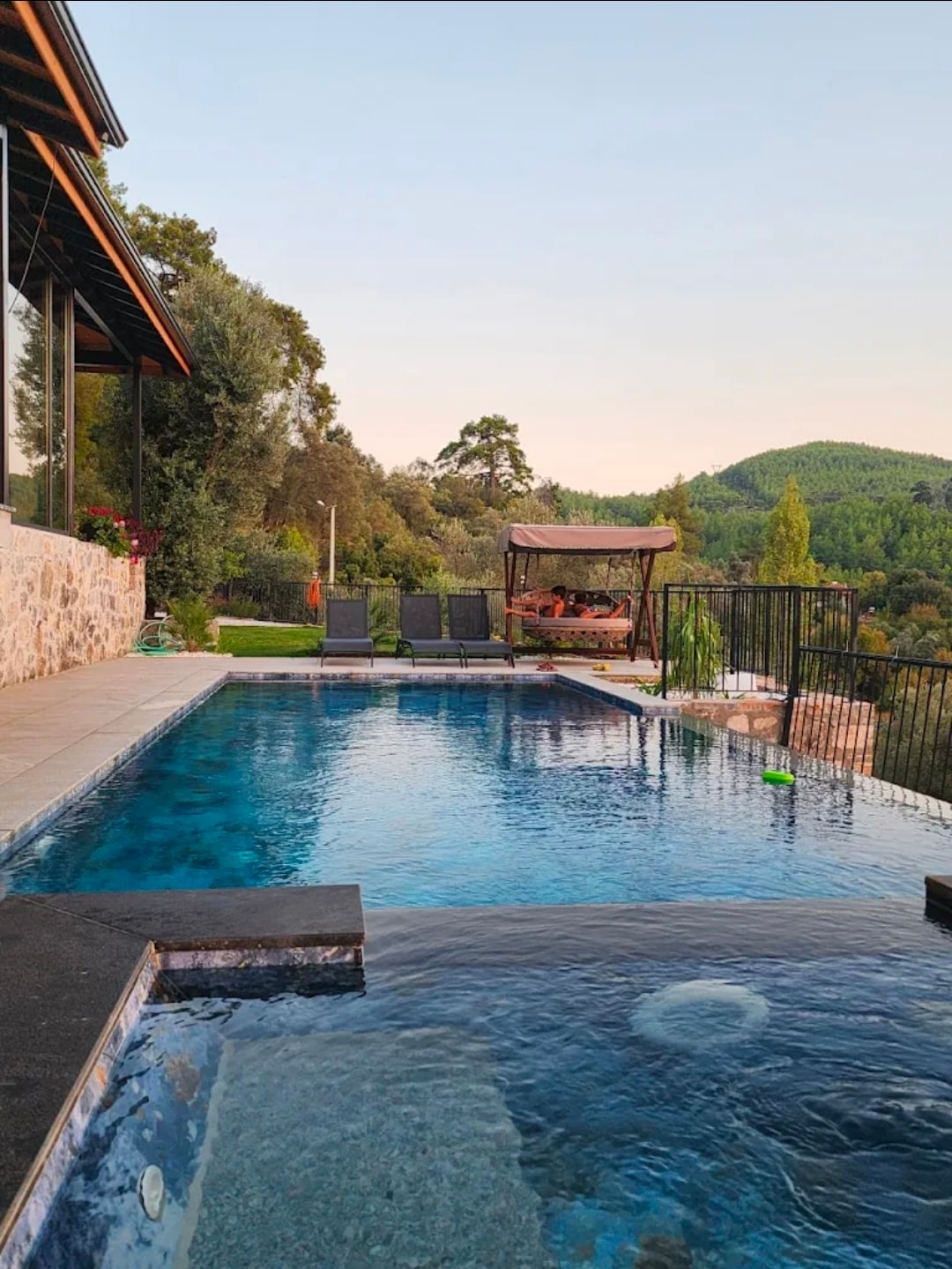 Una villa tranquila en una naturaleza magnífica. Puede hacer senderismo, comer fruta del jardín y pasar un rato agradable en el porche. Querrás quedarte en el momento con el jacuzzi al aire libre, la sauna al aire libre, la ducha de choque, la hamaca, el columpio, la sala de fitness, la barbacoa, el bar con vistas y la piscina con cascada. Se ofrece servicio de barbacoa (carne y aperitivos), gözleme y pan de pueblo. Un lugar cálido que hemos decorado con esmero, a 20 km del aeropuerto, a 300 m del mercado y a 8 km del mar...