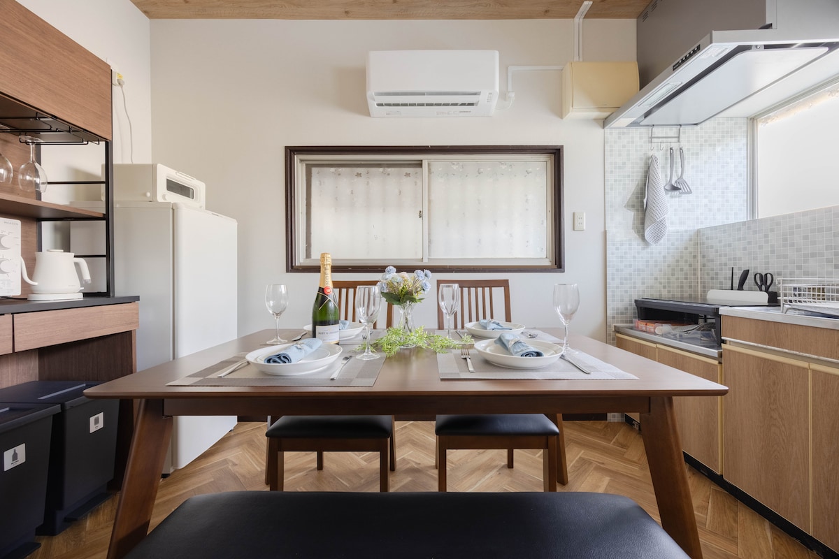 Adultos hasta 4. 2 camas dobles (+ hasta 2 colchones de suelo adicionales disponibles por un cargo adicional) Una casa elegante y acogedora en una zona residencial tranquila, a 2 minutos de la playa. Diseñado con calidez y creatividad, el espacio cuenta con texturas de madera, una cocina y un comedor abiertos y un ambiente tranquilo perfecto para relajarse o trabajar a distancia. Relájate en la azotea con una mesa de comedor, perfecta para tomar un café, comer y disfrutar de las vistas del monte Fuji. Respeta a los vecinos; no se permiten fiestas ni reuniones ruidosas.