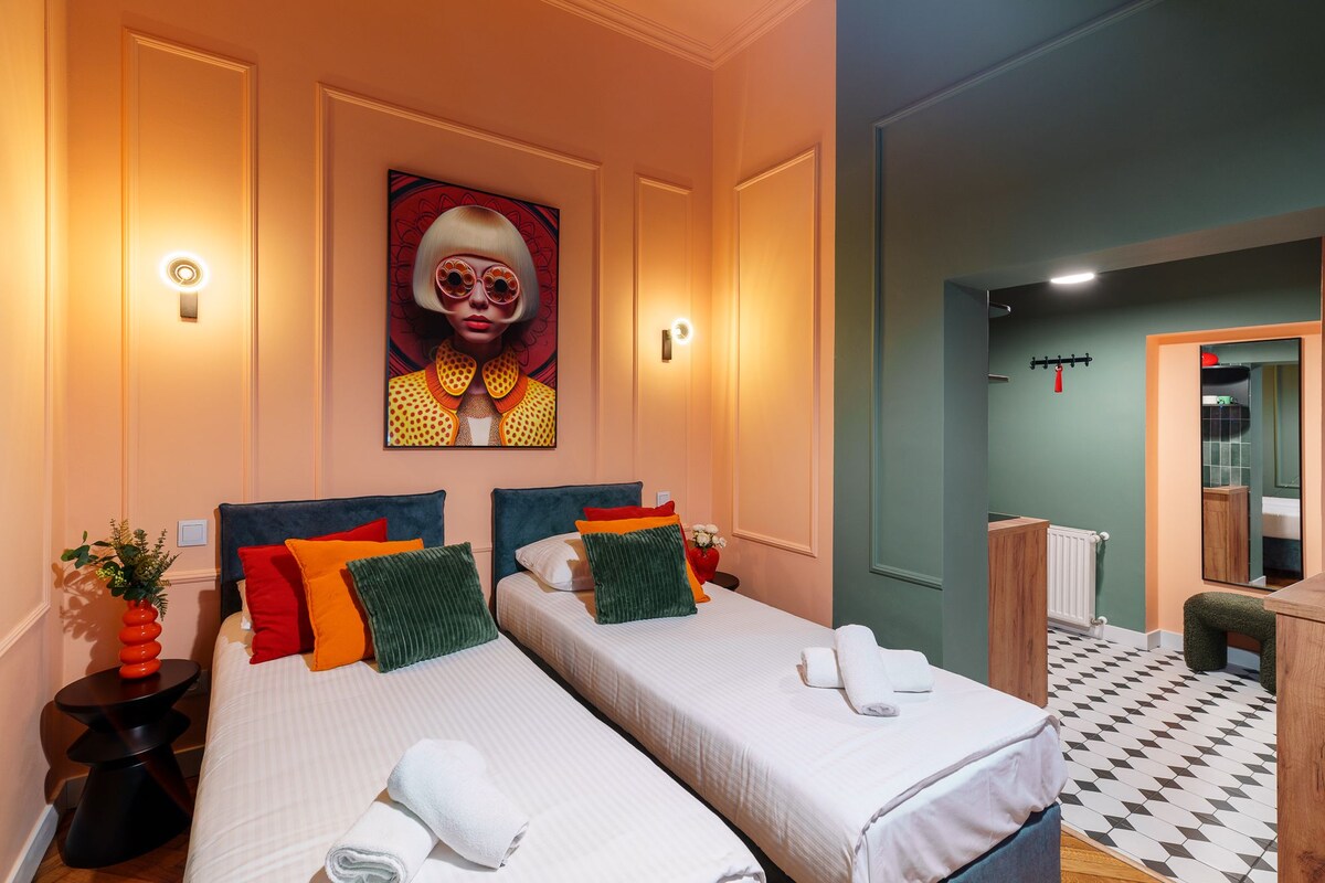Stylowe studio w samym sercu Krakowa Zapraszamy do naszego nowoczesnego i kolorowego studia, położonego w samym centrum Krakowa – zaledwie kilka minut spacerem od Rynku Głównego i klimatycznego Kazimierza. To idealne miejsce zarówno na krótkie, jak i dłuższe pobyty w mieście. Studio znajduje się na parterze składa się z przestronnej sypialni z wygodnym podwójnym łóżkiem, rozkładaną sofą, w pełni wyposażonego aneksu kuchennego oraz nowoczesnej łazienki z dużą kabiną prysznicową.