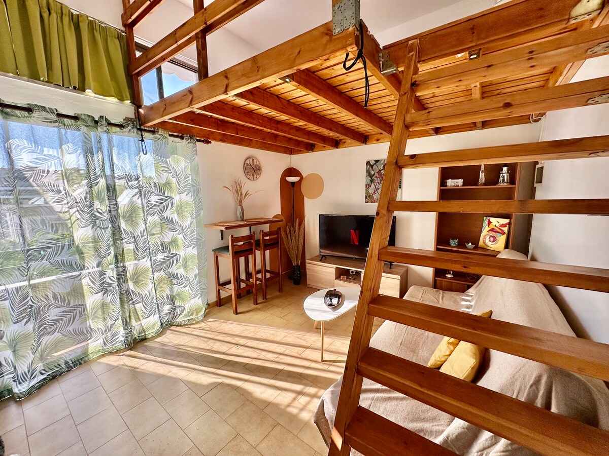 Una casa pequeña y elegante con todo lo necesario, recientemente renovada. El elemento de madera predomina, mientras que su gran altura da una sensación especial a los escasos 25 metros cuadrados. En el balcón, desde el que se ve un jardín verde, se encuentra el baño de la casa justo al lado de la puerta del balcón. El columpio en el salón aumenta la sensación de relajación y las anillas, uno de los mejores instrumentos de gimnasia, ¡le permiten mantenerse en forma incluso durante sus vacaciones!