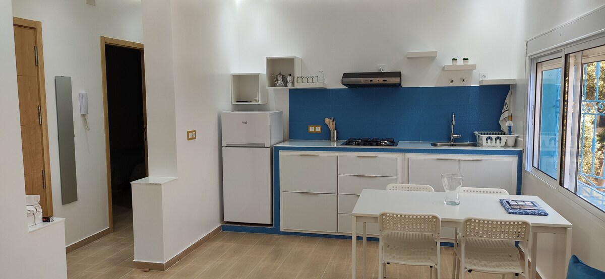 Apartamento Nº2 - La playa de Ksar Sghir. Moderno, luminoso, a solo unos pasos de la playa sin tener que cruzar la calle. Paso fácil, incluso con un cochecito. Tranquilidad asegurada al sonido de las olas. Comodidad: doble acristalamiento, cortinas eléctricas, Smart TV, Wi-Fi, cocina equipada, colchón médico, ducha italiana. A 10 minutos del puerto de Tánger Med y a menos de 2 minutos de los servicios: farmacia, médico, tiendas, banco. Ideal para una estancia relajante en familia o viajero ocasional.