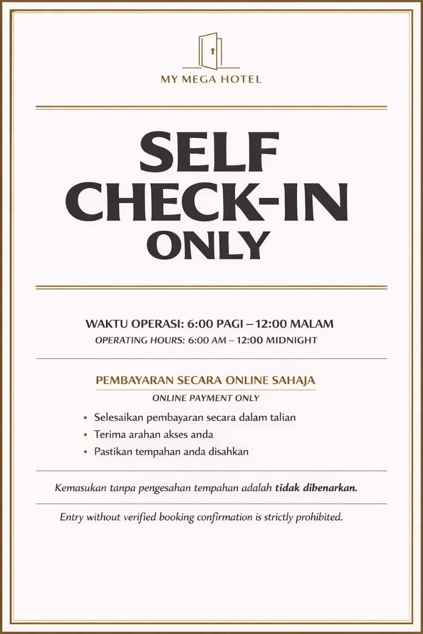 MY MEGA HOTEL - Self Check-In Strategik & Selesa / Strategic & Comfy Near UTM: 5 min drive to UTM Skudai. 24H Convenience: Kedai makan, dobi, klinik & mart 24 jam. Easy Access: Berdekatan AEON Mall & mesra bas. Note: Admin aktif 7AM-12AM. Tempahan selepas 12AM diproses pagi esok (7AM).
