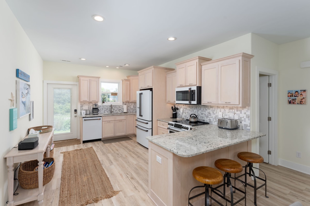 Disfruta de una escapada familiar perfecta frente al mar en West Beach, Oak Island. Esta unidad de segundo nivel de nuestra casa de playa tiene entrada independiente, dos dormitorios, un baño y capacidad para seis personas. La cocina está totalmente equipada con ollas, sartenes, utensilios, nevera de tamaño completo, microondas, cocina/horno y lavavajillas. Disfruta de amaneceres y atardeceres en la enorme terraza mientras observas las olas y los delfines ocasionales. Si tus fechas no están disponibles, consulta la disponibilidad de nuestra unidad de primer nivel en www.airbnb.com/h/oki1