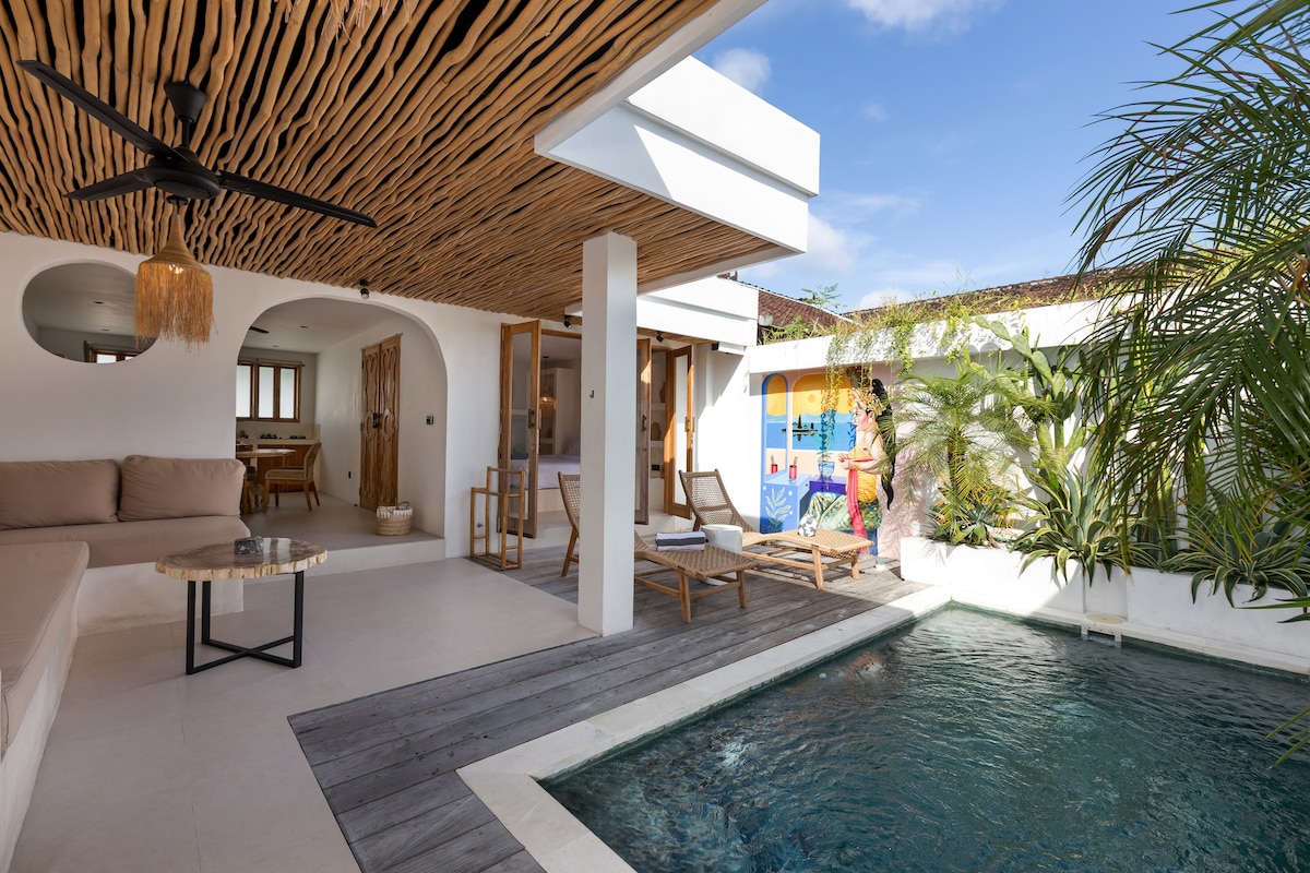 Villa Ruko es una villa privada de lujo con 1 dormitorio y piscina ubicada en el corazón de Seminyak, ¡la capital de compras de spa y boutiques de Bali! Esta villa única está situada en una calle tranquila a pocos pasos de Eat Street. A 2 minutos a pie de Sisterfields. Villa Ruko Seminyak tiene capacidad para dos personas, siendo una villa solo para adultos. La decoración moderna, inspirada en una «tienda», con paredes de hormigón pulido, incluye una zona de cocina moderna completa con incluso una máquina Nespresso para tomar el café de la mañana junto a la piscina.