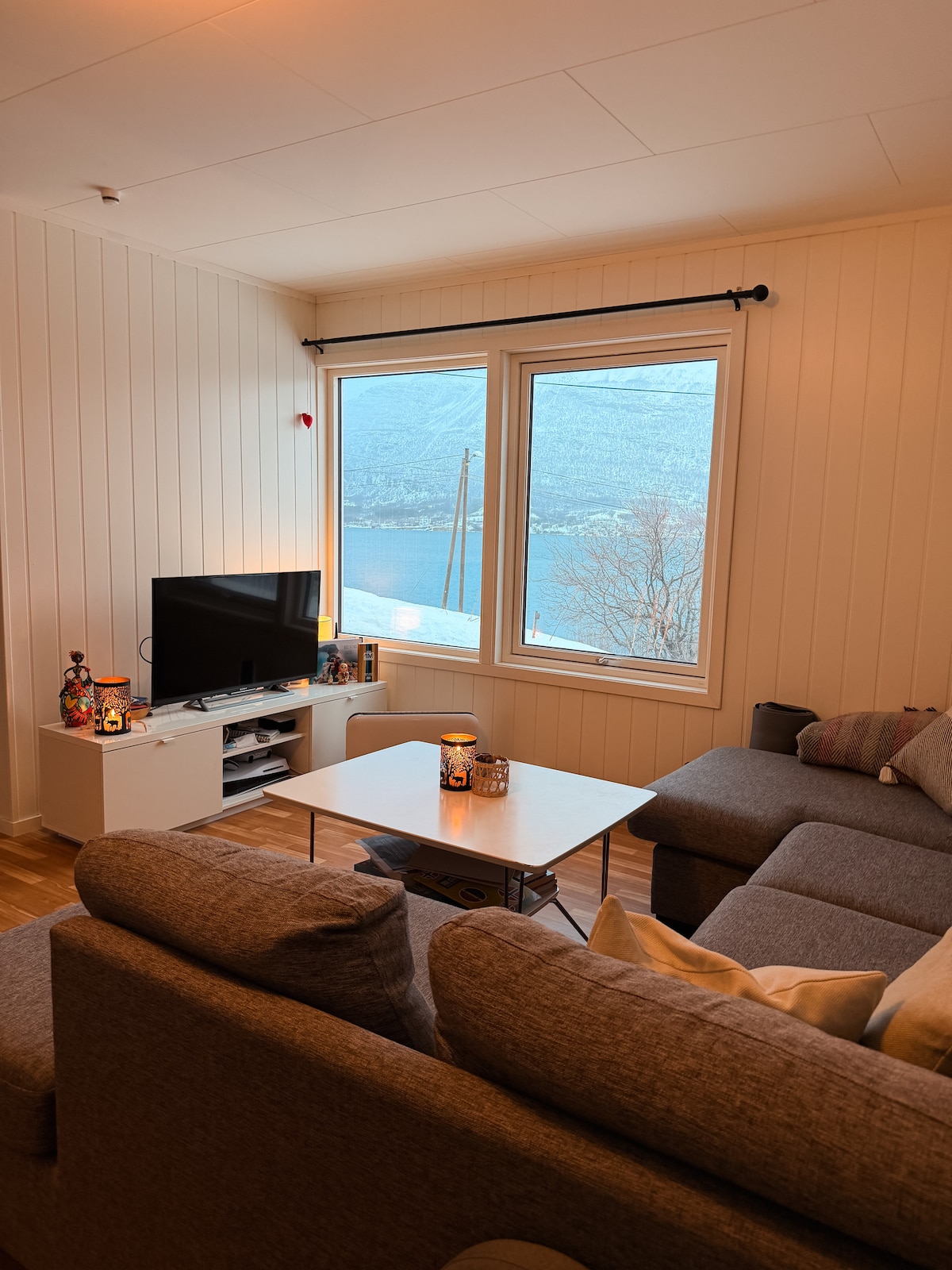 A solo 10 minutos en autobús del aeropuerto y a 2 minutos del centro de la ciudad, con excelentes restaurantes, bares, tiendas y museos, nuestra elegante casa de dos dormitorios es el lugar perfecto para experimentar Tromsø. Disfruta de excelentes vistas del fiordo, la Catedral del Ártico y las montañas desde el salón o observa las auroras boreales desde nuestro balcón o la acogedora zona al aire libre con fogata. A 5 minutos a pie del supermercado y a 10 minutos del pintoresco Prestvannet, uno de los mejores lugares para ver la aurora boreal de Tromsø con muchas pistas de esquí/senderismo.