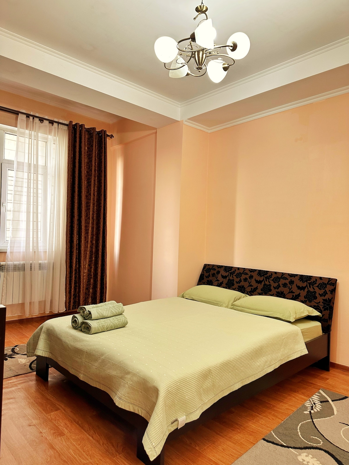 Bright and cozy modern apartment in the center of Bishkek, located in a quiet green courtyard. Fresh renovation, natural wooden floors, new furniture, and modern appliances create a warm home like atmosphere. One bedroom with a walk in wardrobe, living area, and fully equipped kitchen. Orthopedic mattress, fast Wi Fi, cable TV, air conditioning, and a comfortable workspace. Open balcony facing a green yard and a loggia on the opposite side. Self check in via secure lockbox. Ideal for your stay.