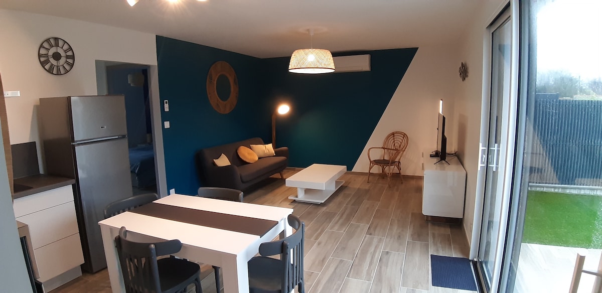 Dúplex nuevo residencia tranquila ideal para 2 adultos y 2 niños Arriba un gran dormitorio con 1 cama 2 personas 140X200 ropa de cama nueva y BZ para 2 personas (140x190) Un gran biombo para la intimidad Camas equipadas con protectores desechables para poner si se lleva la ropa de cama Planta baja una sala de estar/zona de cocina equipada zona de estar Gran cuarto de baño con ducha Terraza muebles de jardín tumbonas para disfrutar del mar Garaje 3 cerrado con llave dos bicicletas con antirrobo Clasificado 2 estrellas OT