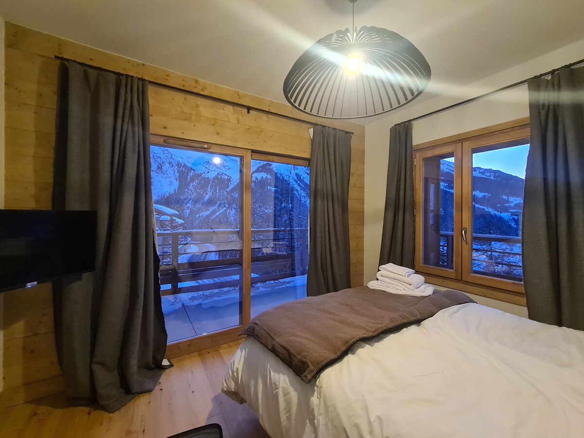 Au coeur de la station de Sainte Foy en Tarentaise (1500-2600m), venez passer vos vacances en famille ou entre amis dans notre appartement, 4*, style chalet contemporain, 115m2, à 3 minutes à pied des pistes de ski. Le retour se fait ski aux pieds. 4 chambres, 3 salles de bain, 2WC 1 place de parking privative Casier à skis avec chauffe chaussures (pour 6 paires) Linge (draps et serviettes) fourni à partir de 7 nuits, ménage inclus (sauf cuisine) Vue magnifique sur la vallée, grande terrasse