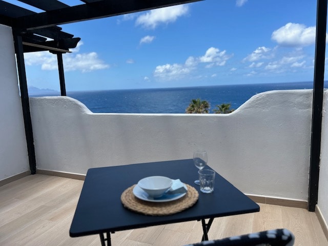 Un precioso apartamento de diseño, recientemente renovado con con impresionantes vistas de atardecer sobre el Océano desde su terraza. Primera línea al mar. Después de un largo día en la naturaleza, descansa en la cama King size (180x200cm) ----- A lovely apartment recently renovated with stunning views of the sunset, first line over the ocean from the terrace. Relax while reading, eating, or doing yoga. After a long day in nature, rest on the King size bed (180x200cm)