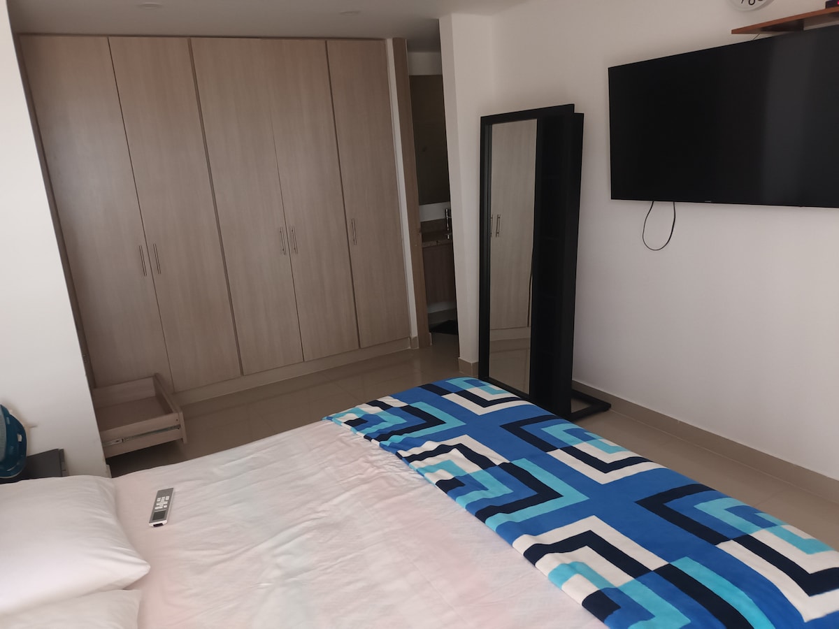 Relájate en este espacio tranquilo y elegante cerca al Centro Comercial Mayales, que consta de sala amoblada con centro de entretenimiento, TV pantalla grande, wifi y balcón con vista a las montañas. Zona de comedor pantry. Cocina dotada de utensilios, nevera y licuadora. Zona de labores con lavadora. Habitación principal con cama doble, TV, clóset, baño interno, aire acondicionado. 2 habitaciones secundarias, cada una con cama doble, aire acondicionado y baño compartido en el pasillo.