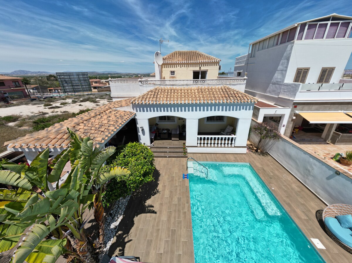 La lujosa villa en las afueras del pueblo de San Miquel de Salinas, cerca de la costa, tiene todo para unas vacaciones maravillosas. Esta villa ofrece una sala de estar, cocina completa, comedor, 3 dormitorios decorados con buen gusto con camas de somier y 2 baños. En el exterior, hay un hermoso jardín con piscina (climatizada) y una gran terraza en la azotea. El jardín tiene una piscina con jacuzzi y varias áreas de sombra con salón, tumbonas y un área cubierta con mesa de comedor y barbacoa.