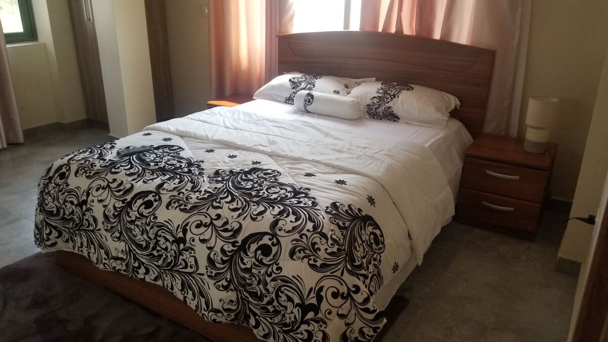 ¡Bienvenido a tu exclusiva escapada urbana en la ciudad de Acra! Con unas vistas impresionantes de las montañas Aburi, a solo unos minutos en coche o a 15 minutos a pie. A menos de 12 millas del aeropuerto, directamente por la M4 sin giros. Nuestro apartamento de dos dormitorios ofrece alegría y comodidad con seguridad las 24 horas, los 7 días de la semana, electricidad y agua las 24 horas, los 7 días de la semana, con servicios exclusivos, como piscina, terraza en la azotea, gimnasio moderno, cocina completa, wifi, barbacoa y mucho más que harán que tu estancia sea verdaderamente inolvidable.