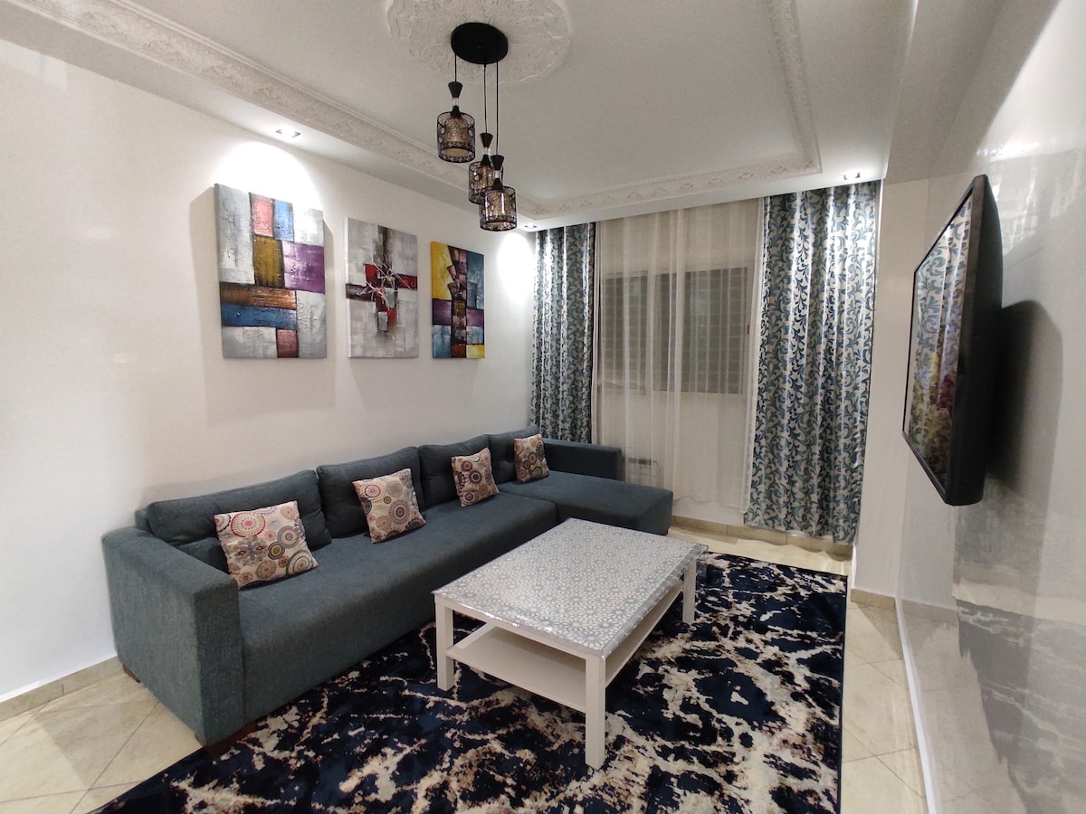 Relájese en este tranquilo y elegante apartamento, cerca de : (Distancia en coche) - A 5 min del aeropuerto internacional de Tánger - A 5 min de la Zona Franca de Tánger. - A 5 min del Centro Hospitalario Universitario (CHU). - 5 min de la Facultad de Medicina - 5 min del Bosque Diplomático. - 8 min de la nueva playa de la ciudad, Ibn Battuta. - 16 min de las Cuevas de Hércules - 30 min de la ciudad de Asilah Apartamento para no fumadores.