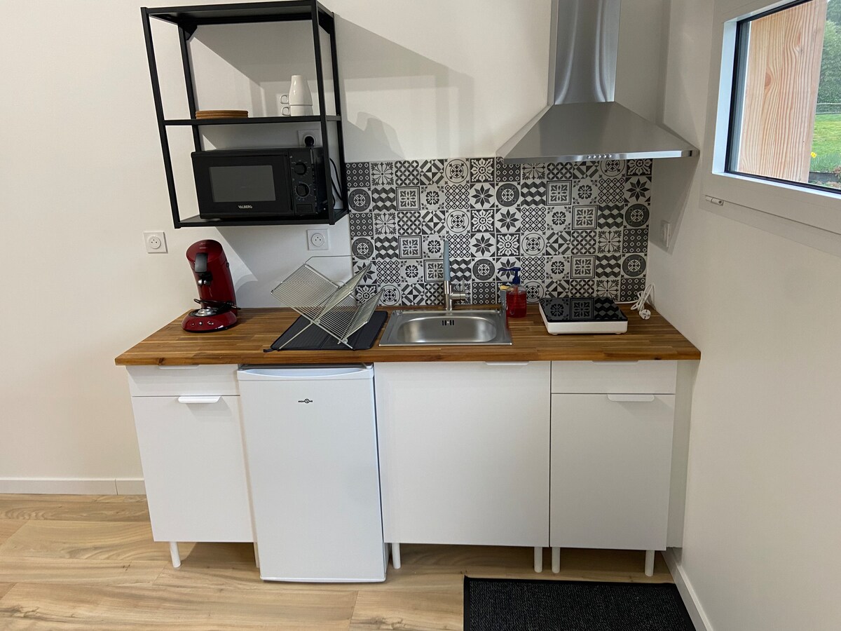Estudio con cama doble. Hay un baño con cabina de ducha, lavabo e inodoro. cocina equipada con placa de inducción, fregadero, microondas, refrigerador, cafetera con monodosis. vajilla y ollas. Una mesa y 2 sillas, un televisor inteligente. Puede aparcar junto al alojamiento. alojamiento ideal para viajes de negocios. El alojamiento se encuentra en un pequeño pueblo de Remouillé a 15 minutos de Clisson, a 25 minutos de Nantes, a 15 minutos de Montaigu.
