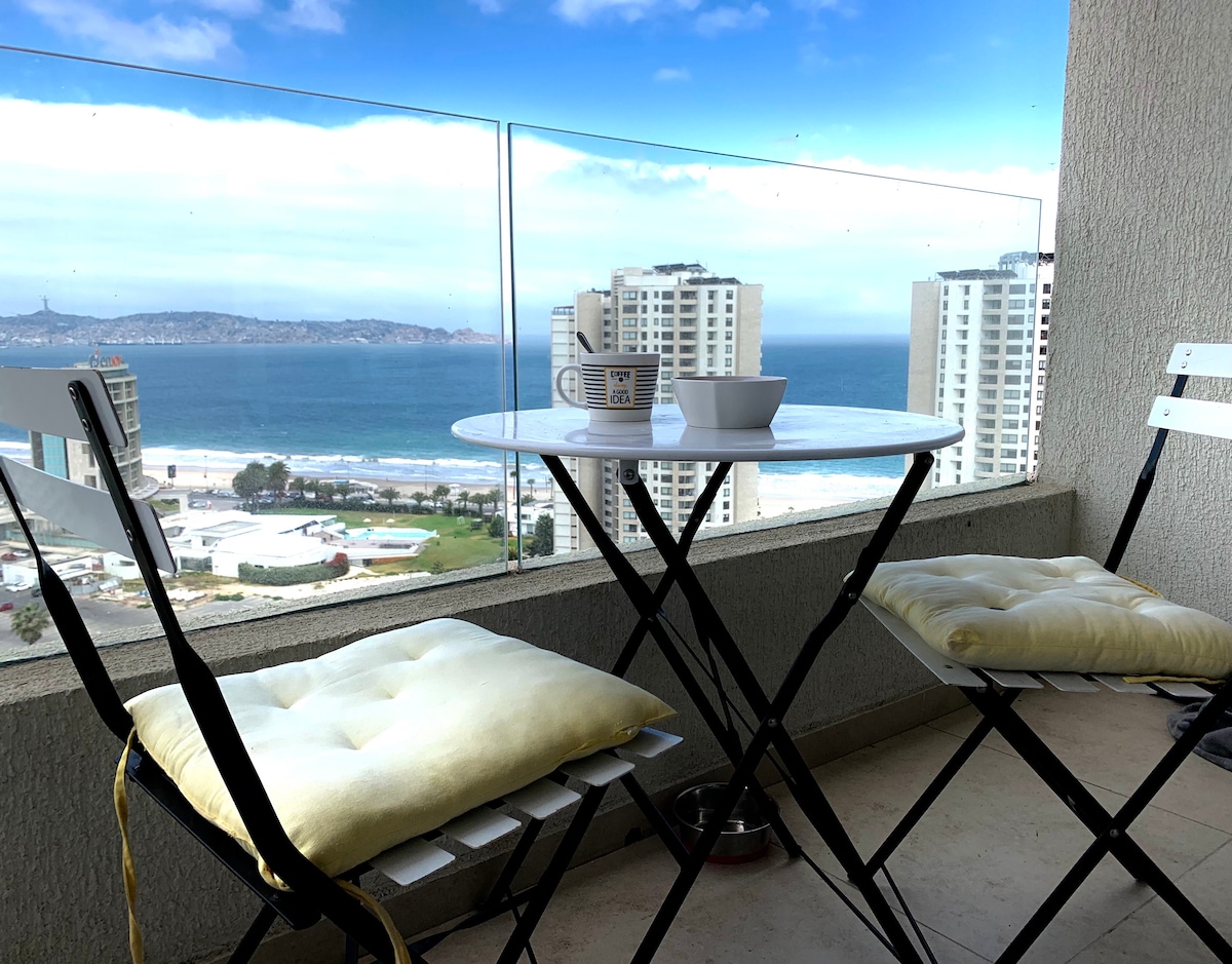 Lindo y comodo departamento de 1 dormitorio ubicado en plena Avenida del Mar, en un 5to piso frente al mar, se encuentra a solo 7 minutos caminando del casino y en su entorno cercano hay cafés, pubs, restaurant y minimarket. Nos preocupamos de cada detalle de su decoración, como también que cuente con buenos colchones y estamos mes a mes renovando el lugar. Cuenta con estacionamiento cubierto y wifi.