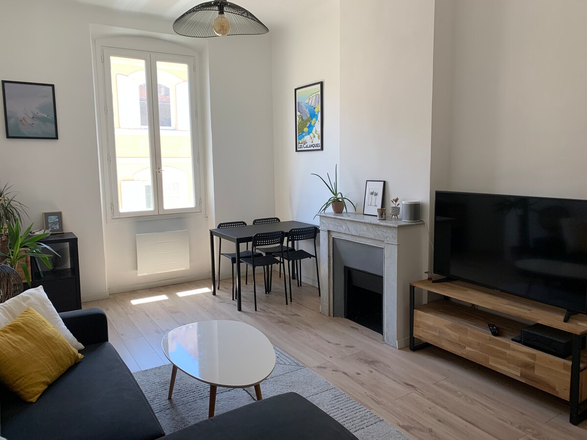 Muy bonito apartamento en el barrio de Cours Julien. Completamente reformado, luminoso, con una gran terraza soleada orientada al sur. En una segunda planta (sin ascensor). Cerca de todas las actividades, a 15 minutos andando del Puerto Viejo y la estación de tren de Saint Charles, un apartamento ideal para descubrir Marsella. El alojamiento: - Un gran salón con una cocina contigua, muy funcional - Dos dormitorios con cama doble - Un cuarto de baño reformado con ducha a ras de suelo