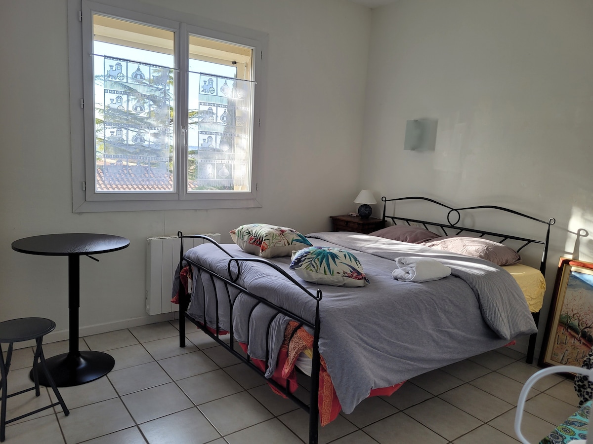Estudio independiente, con entrada y salida propias, en garaje de casa unifamiliar en las laderas y muy cerca del pueblo de Castanet Tolosan, al final de un camino privado. Una plaza para aparcar delante de la casa. Recepción y entrega de llaves por parte de la familia. 25 m2 todo limpio, con lo necesario para instalarse, cocinar, trabajar… A 15 minutos a pie del centro de Castanet con tiendas, restaurantes, pequeño cine. Parada de autobús al final del camino para llegar a la estación de metro de Ramonville.