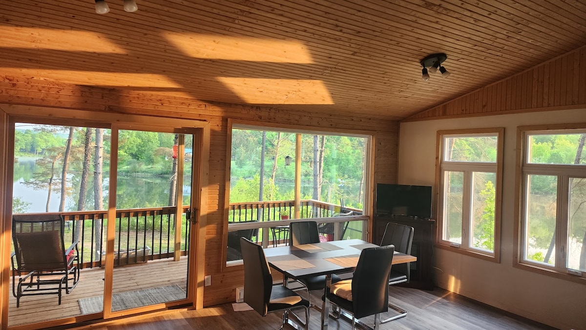 Escápate a nuestra casa mejor valorada, frente al lago, un refugio mejorado de 3 dormitorios + barracón separado, 2 baños, para todas las estaciones, a solo 1 hora y 20 minutos de Parliament Hill. Con impresionantes vistas, un porche con mosquitero, un increíble muelle de verano, una relajante chimenea al aire libre, kayaks, raquetas de nieve, una acogedora chimenea y espacio para 8 personas, esta no es una escapada cualquiera. Totalmente equipado, muy bien mantenido y perfecto durante todo el año. Una escapada tranquila a la naturaleza con todas las comodidades del hogar, ¡y algo más!
