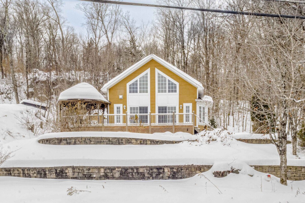 Bienvenue chez vous, que vous soyez une FAMILLE, un couple ou pour venir y travailler en TÉLÉTRAVAIL. Ce chalet complètement équipé saura vous plaire avec ses grandes fenêtres ouvertes sur la nature. Le chalet est près du bâtiment principal où vous pourrez y trouver deux PISCINES CHAUFFÉES (fermée de octobre à mai), un spa, deux SAUNAS et BILLARD. À l'arrière du chalet se trouve le début d'un beau sentier pédestre qui longe un cours d'eau. À proximité vous pourrez y faire plusieurs activités.