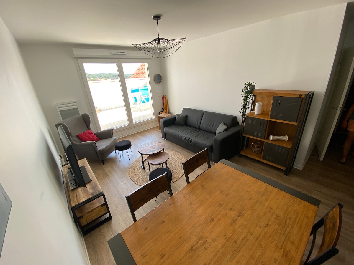 Appartement rénové type T2 (petite chambre séparée) de 25m2 avec prêt de vélos, au premier étage avec vue sur l'océan . Linge de maison fourni (draps/serviettes/torchons). Résidence "Pierre et vacances" avec piscines, accès direct à la plage (50m) et proche des commodités. Vous trouverez dans le logement un lave vaisselle et un lave linge, du linge de lit et toilette sont également à votre disposition. Vous profiterez d'un grand balcon orienté ouest face à la mer.
