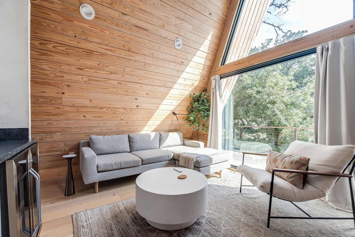 Escape to a modern A-frame treehouse just outside Fredericksburg. Nestled on 17 acres, the Pecan Cabin offers Hill Country views, stargazing, and deer sightings, yet you’re minutes from Main St. Swim in the container pool, gather at the fire pit, or simply unwind on your private balcony. Inside, enjoy a king bed, dual rainfall shower, luxe linens, and modern amenities. The perfect blend of nature and comfort awaits.
