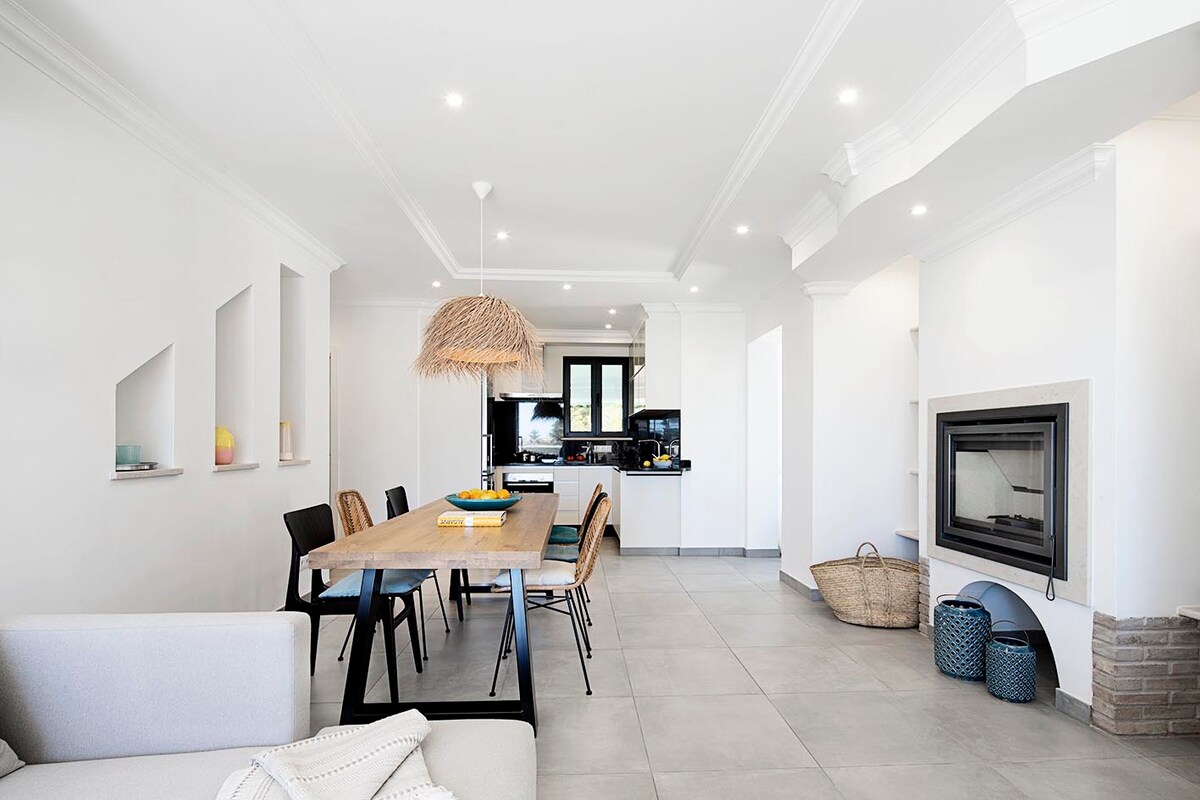 El comedor espacioso, luminoso y elegante con una cocina muy bien equipada ofrece espacio para hasta cuatro personas. Las cortinas de colores claros ondean en la brisa frente a las grandes puertas correderas. En el exterior, un pequeño conjunto de escaleras conduce al tejado, desde donde se puede disfrutar de unas vistas impresionantes de Carvoeiro y se puede cenar con estilo bajo un toldo con vistas al mar azul.