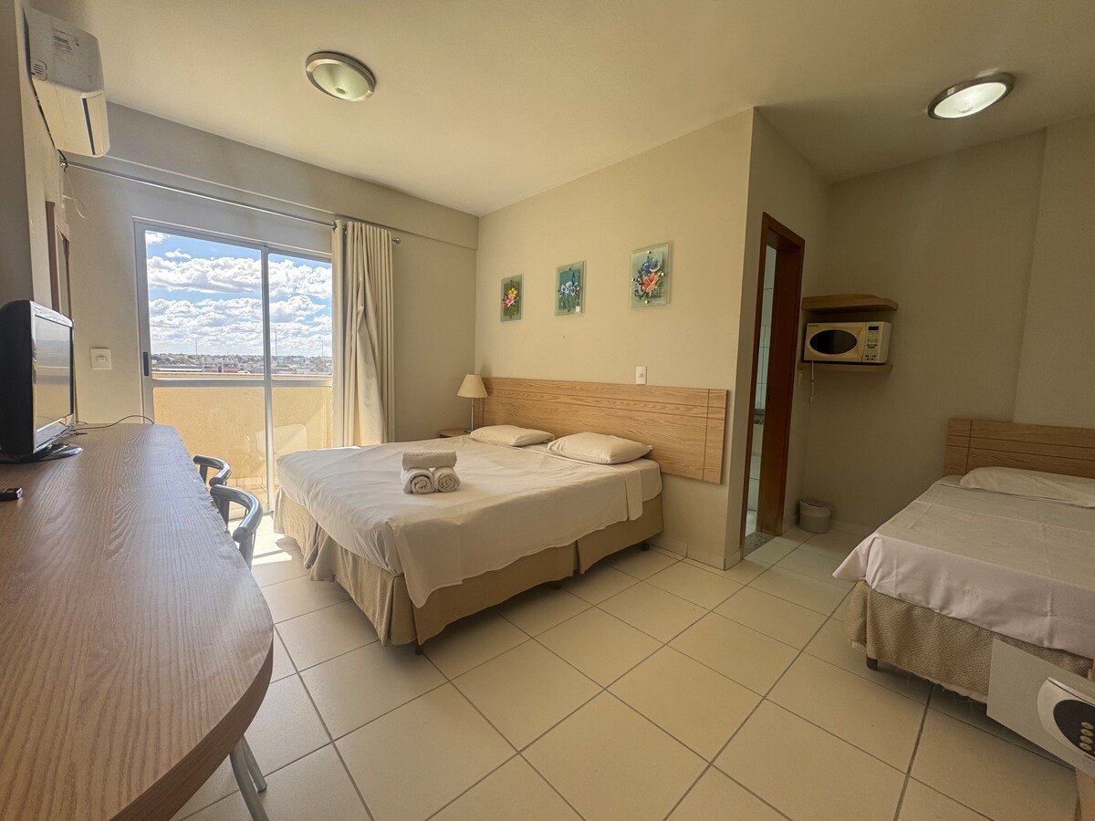 Apartamento en Lagoa Quente Hotel, en Caldas Novas, ideal para familias y parejas, con capacidad para hasta 7 adultos y ubicado frente a Lagoa Parque. Tiene 1 cama doble, 1 cama individual, 1 colchón adicional y 2 sofás cama, así como aire acondicionado, televisores, AirFryer, refrigerador, microondas y utensilios básicos de cocina. No incluye ropa de cama, toallas, comidas, bebidas ni boletos. No se admiten fumadores ni mascotas.