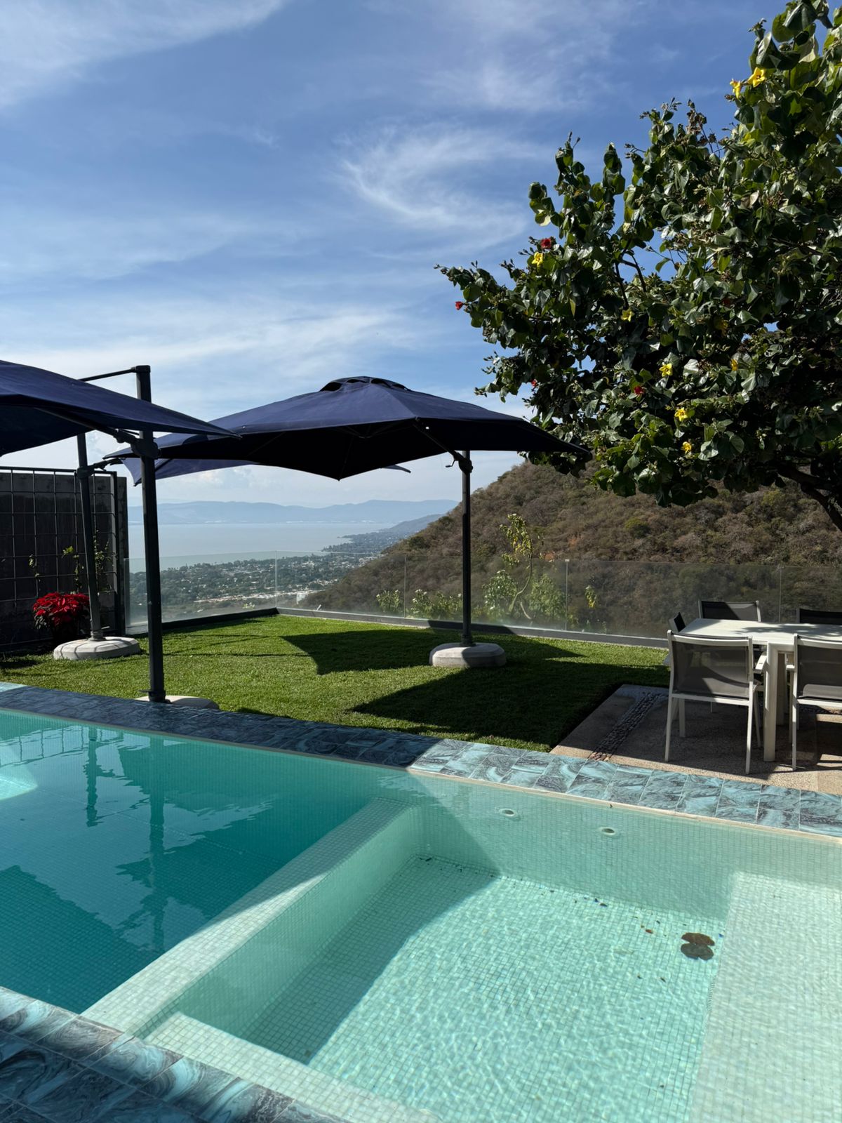 Vista Infinita A beautiful modern home with expansive southern views of Lake Chapala. The decor is contemporary Mexican. Great privacy between bedrooms, each with its own luxury bathroom. Large pantry and two car garage. Well equipped kitchen with gas cooktop. BBQ. Easy access, no stairs. 13 meter infinity pool & jacuzzi spa: heated! Gas fireplace. Screens through out with large smooth operating sliding doors. Luxury linens, spa like white fluffy towels. Artful and decorative!
