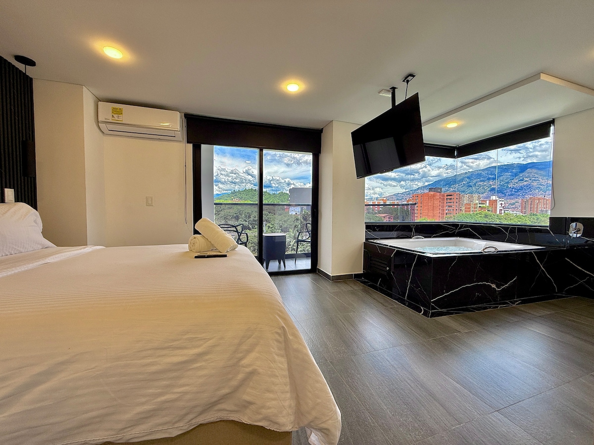Experience Medellín in this stylish and exclusive open-plan studio near Parque Lleras with private jacuzzi, A/C, king-sized bed, 54" rotating smart TV, Netflix, workspace with high-speed Wi-Fi, fully equipped kitchen, washer/dryer, tea/coffee station, and black-out curtains. Enjoy amazing city views, superb interior design and finishes, gym, sauna, swimming pool, and on-site bars, restaurants, cafeteria, and art gallery — the ultimate exclusive retreat for comfort, style, and vibrant nightlife.