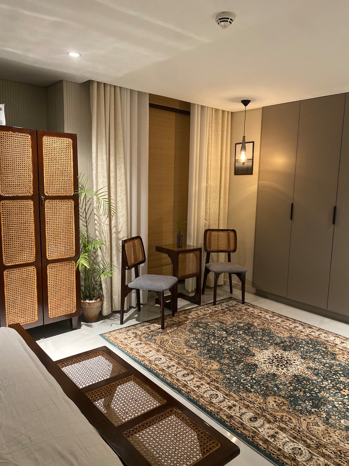 Thoughtfully styled with authentic cane heritage furniture, this apartment carries the quiet poetry of old Lahore warm textures, soft light, and a nostalgia you don’t have to explain. It’s not just a stay, it’s a feeling. Located right on MM Alam Road, you’re surrounded by Lahore’s most vibrant cafés, restaurants, and boutiques—yet inside, it feels calm, grounded, and gently removed from the noise. A blend of heritage charm and urban convenience