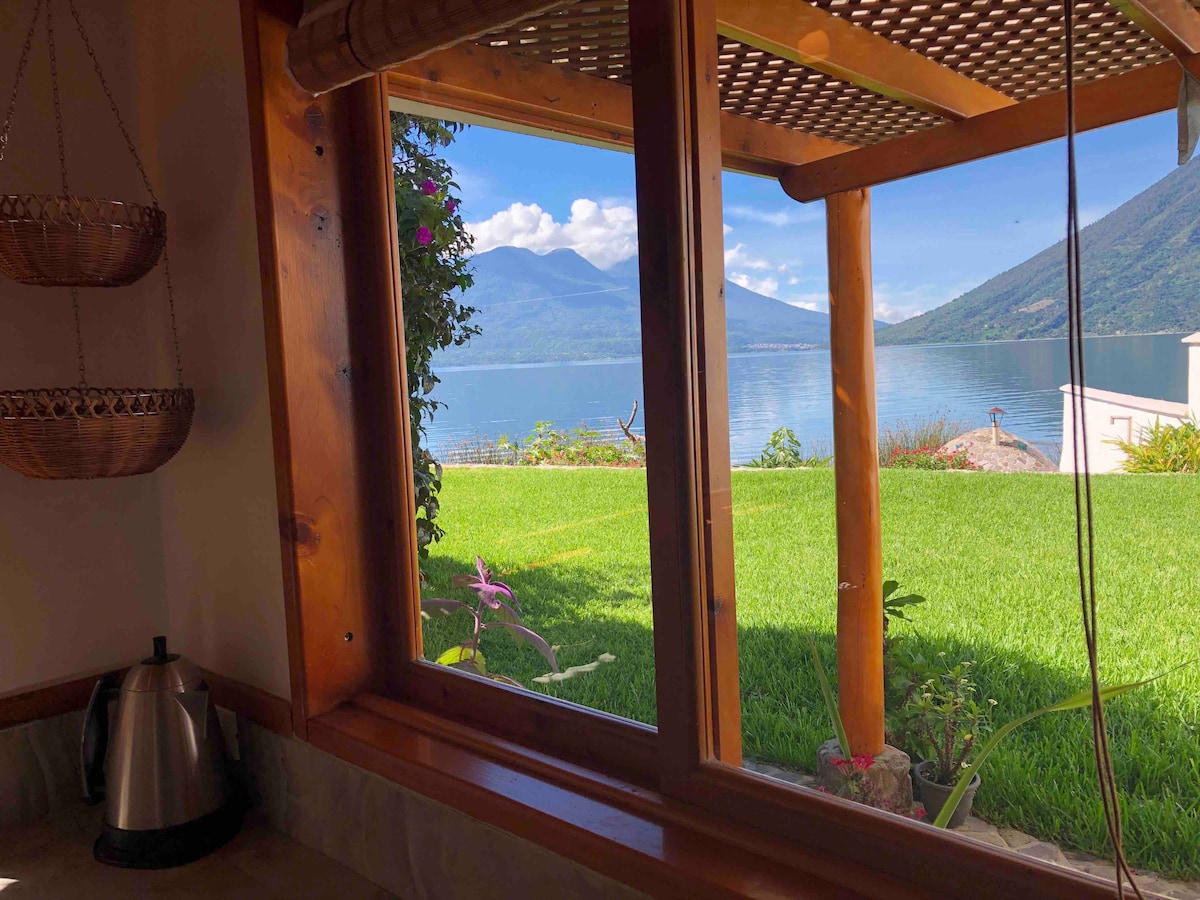 Una bella villa a orillas del lago, a 3 minutos de restaurantes y muelle público. Vistas increíbles de 6 volcanes. Amenidades privadas solo para Peace of Heaven que incluyen enormes jardines, una gran playa, jacuzzi solar, una chiminea en el salón principal, temexcal, gazebo, churrasquera, horno de pizza. El precio es para 6 huespedes y cada adicional paga extra. Para grupos grandes ofrecemos varias opciones cada una con entrada privada y protegida por un guardián.