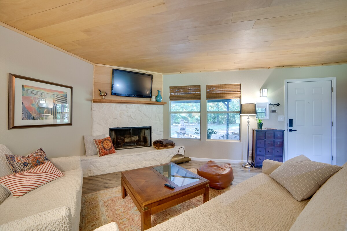 ¡Escápate a esta cabaña actualizada escondida en 2 acres con un jardín secreto como sendero para caminar! Disfruta de una conversación agradable alrededor de dos fogatas diferentes, bebiendo café en el columpio del porche bajo el gran patio cubierto o acurrucándote junto a la chimenea con un buen libro. Puedes ir a pescar a 5 minutos en el puerto deportivo con acceso al lago, pasear por la ciudad para cenar en la plaza o quedarte en casa y jugar en el patio trasero. ¡Esta cabaña tiene todo lo que necesitas para la escapada que te mereces!