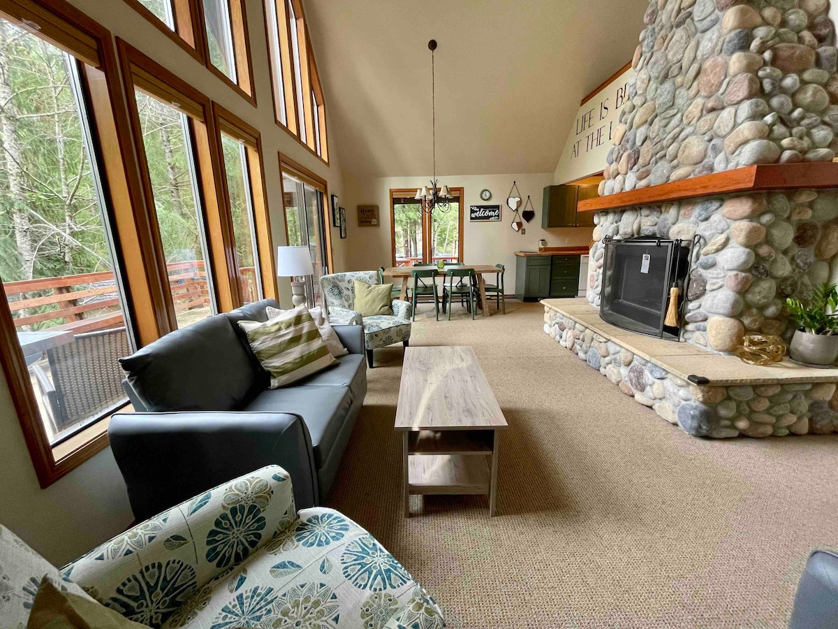 ¡Disfruta de la orilla del lago privada y del muelle desde esta cabaña clásica de 1 dormitorio + loft en forma de A! Cocina y baño recientemente remodelados. ¡Ideal para parejas o familias pequeñas que disfrutan del aire libre! El dormitorio cuenta con literas (perfectas para los más pequeños), mientras que el loft cuenta con una cama tamaño queen moderna de mediados de siglo para adultos. ¡Se proporcionan kayaks básicos, inflables y chalecos salvavidas! ¡Disfruta de la paz y la serenidad de un pequeño lago tranquilo y no motorizado en el bosque en un clásico A-Frame vintage!