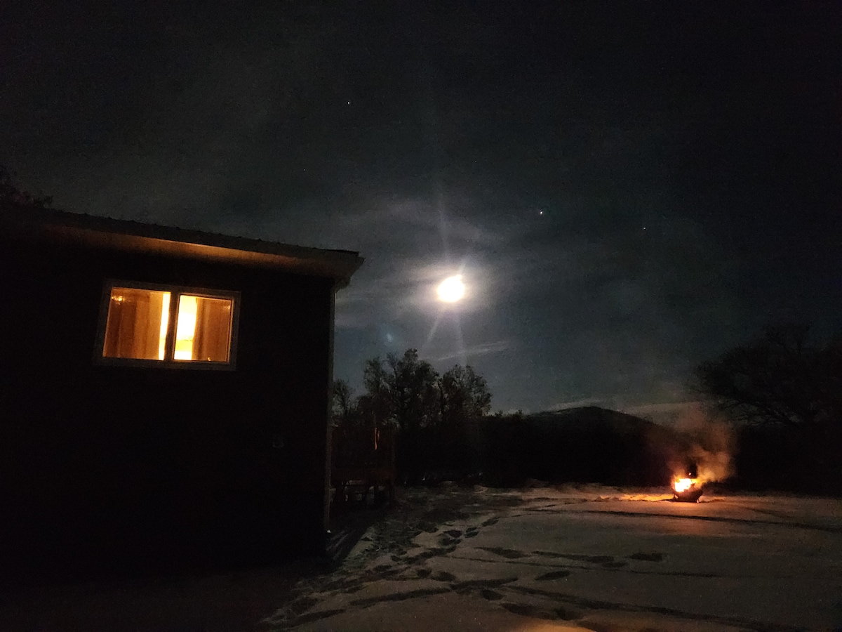 Cabaña muy privada, de nueva construcción, escondida en una pradera. Olvidarás rápidamente que estás a solo unos minutos de la ciudad. Prepara la cena en tu cocina bien equipada. Contempla el amanecer en la gran terraza envolvente. ¡Ducha privada de temporada solo al aire libre! LA DUCHA EXTERIOR ESTÁ CERRADA HASTA 2025. También hay muchas hectáreas de patio para explorar. ¡Realmente tendrás muchas de las comodidades de casa en un lugar como ningún otro! ¡Gran lugar para relajarte! La cabaña tiene servicio de celular pero no wifi.
