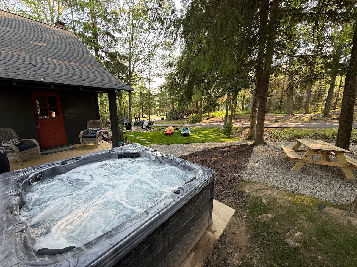 The Lure is a fully renovated 1940s fishing cabin reimagined into romantic waterfront retreat for 2 on the glacial waters of Round Pond in Lake Harmony. Designed for couples, this home pairs vintage charm with modern indulgence--private hot tub beneath the stars, crackling wood-burning fireplace, fire lit evenings by the shore, and quiet mornings drifting by canoe. Secluded yet moments from adventure: hiking, dining, skiing, Jim Thorpe, and Pocono Raceway--where romance lingers and time slows.