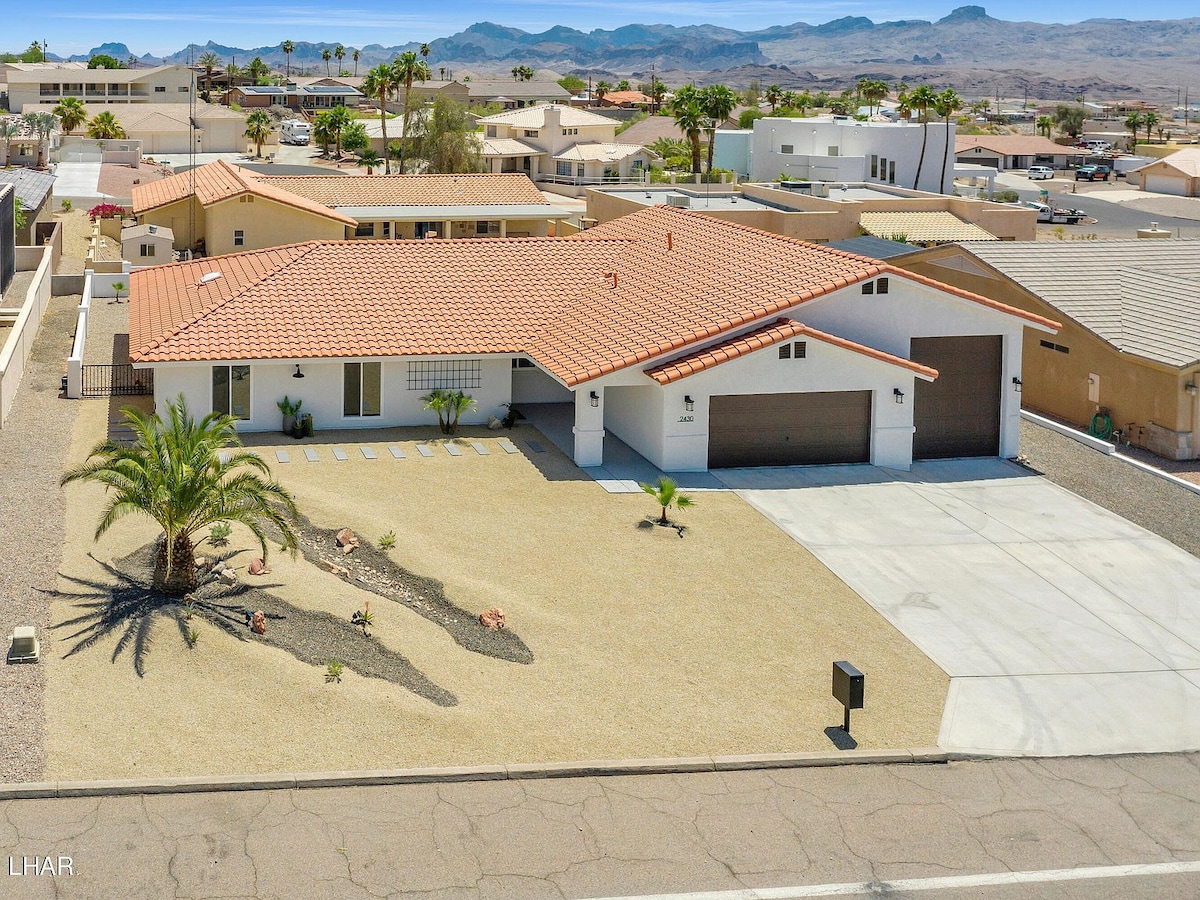 ¡Te esperan días soleados y puestas de sol de acuarela en el lago Havasu! Trae a toda la familia, incluidos los perros, para disfrutar de un sinfín de entretenimiento y relajación. Esta casa de 2100 pies cuadrados, 3 camas/3 baños con plano de planta abierta y 2 dormitorios principales es lo suficientemente espaciosa para 2 familias. Disfruta de la nueva piscina y del spa para 10 personas. ¡Mucho aparcamiento para coches, barcos y juguetes! Carga gratuita de Tesla con preaviso. Camina hasta Thompson Bay, Body Beach y el canal. A solo 1 milla del Puente de Londres. ¡Coge tus trajes y disfruta del lago!