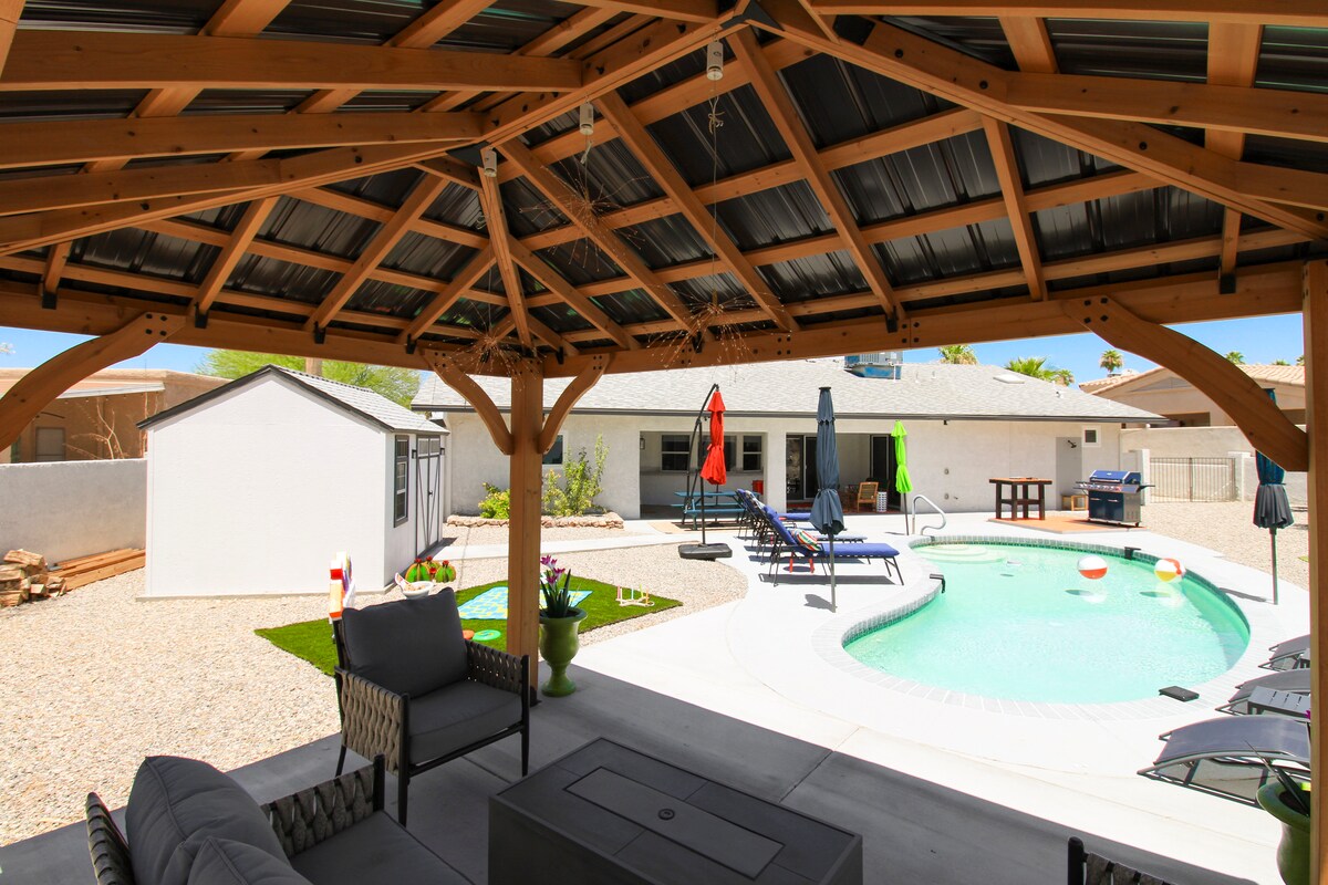Casa recientemente renovada en Lake Havasu con una decoración moderna, una nueva piscina y bañera de hidromasaje. Relájate con estilo con servicios actualizados y un diseño espacioso. Crea recuerdos inolvidables mientras realizas tus actividades favoritas, incluida la piscina de 36 pies, la parrilla de gas (trae tu propio propano), el juego de la herradura, el juego de la bolsa de maíz, la fogata, el paseo en bote, la pesca y mucho más con toda la familia en un lugar tranquilo. Hay un montón de estacionamiento disponible para tu barco o autocaravana.