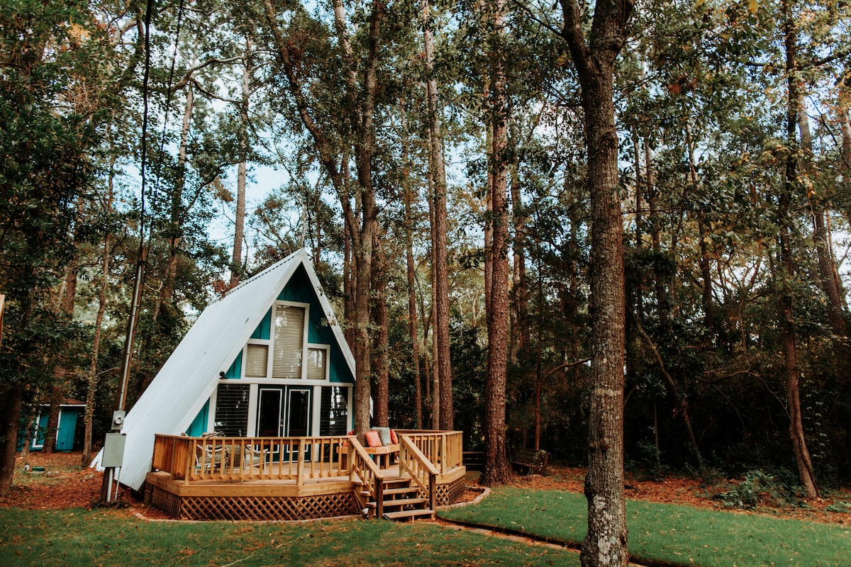 Kick back and relax in this quiet, stylish A-frame, enjoy the nearby lake and park. Close enough to Montgomery and Magnolia, but out of the way enough to enjoy the calm of this woodsy subdivision.