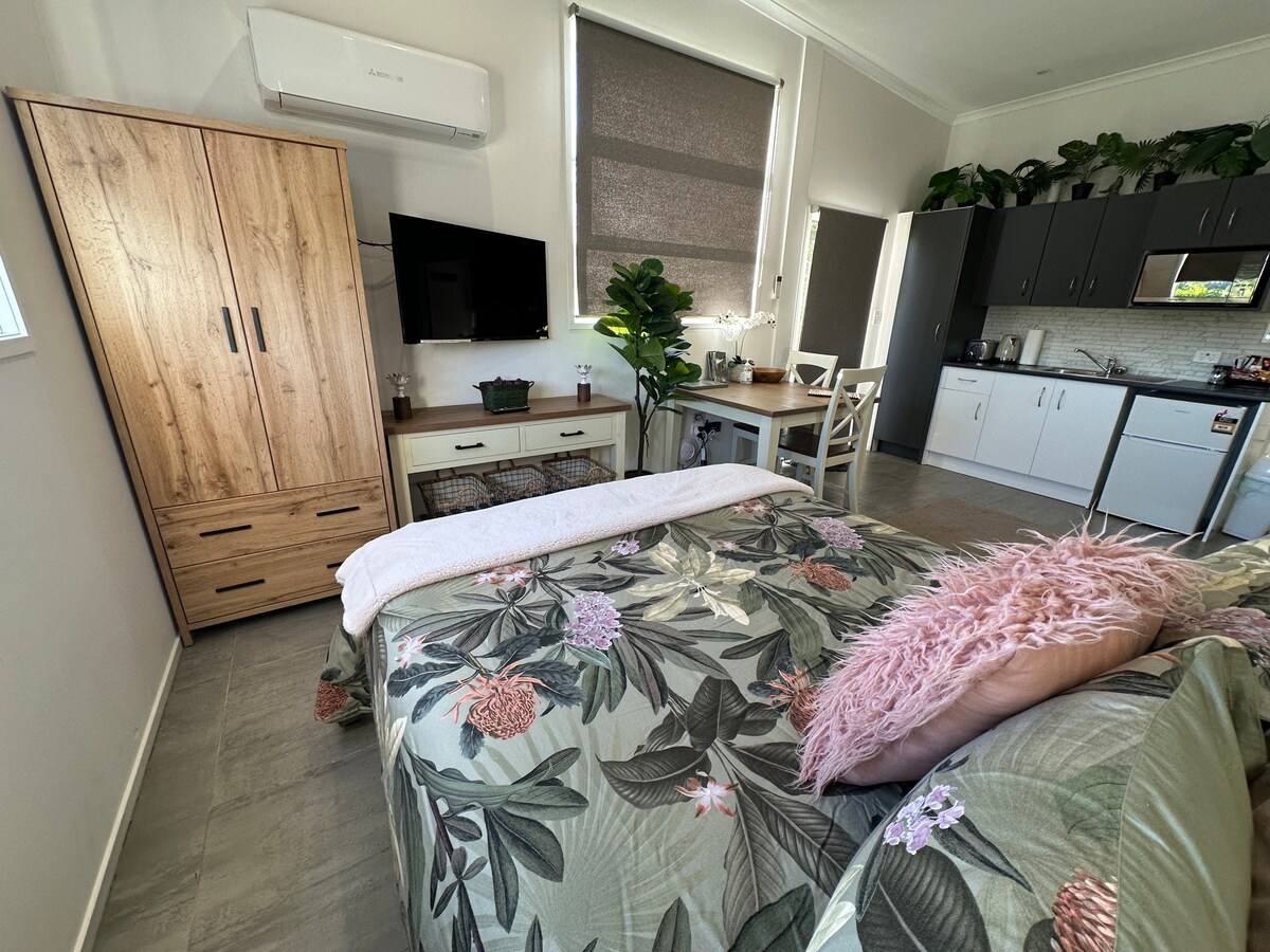 We welcome you to stay in our self contained studio, positioned on the ground floor of our home. If you’re concerned with noise, this perhaps isn’t the place for you as our living room is directly above the studio. We have a young family & 2 dogs who can be noisy at times. Generally from 8pm to 7am it’s quiet. The 1x bedroom studio features kitchen, bathroom, living space with aircon, an outdoor courtyard & roadside parking. It has its own private access, seperate from the main house entrance.