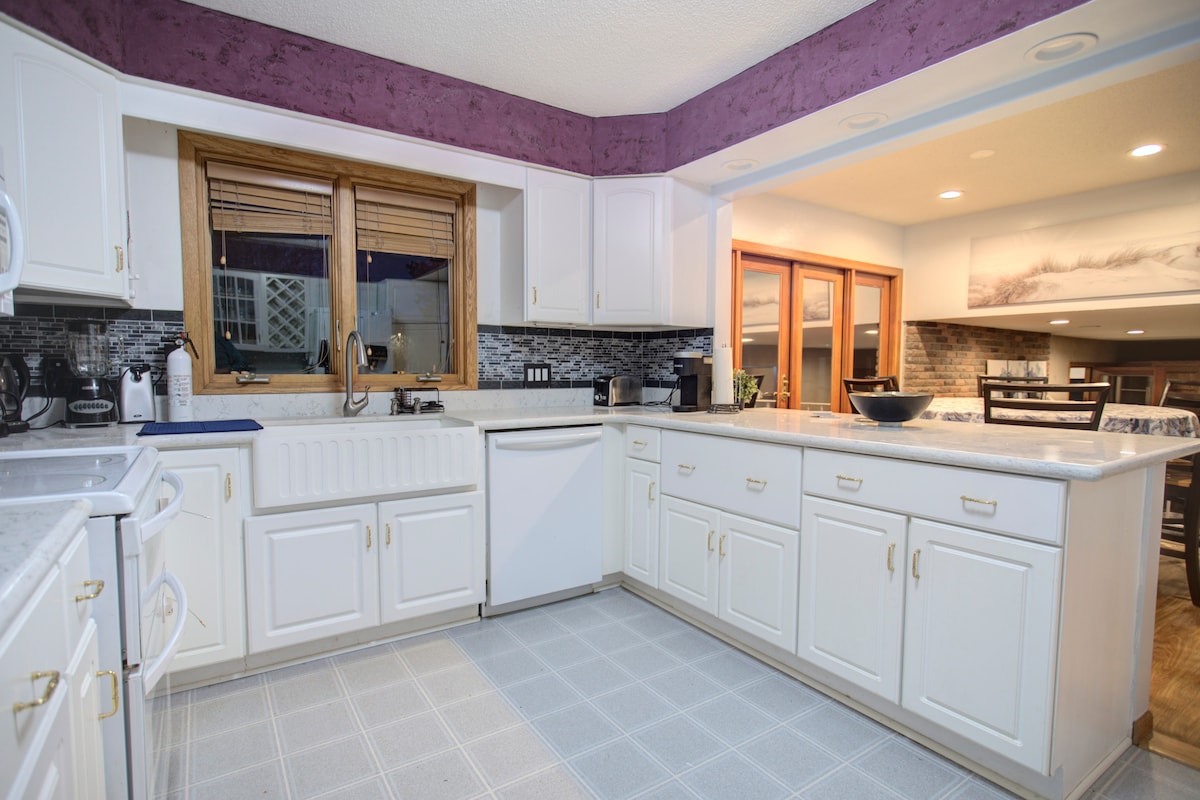 Suite de invitados privada entera de 1500 pies cuadrados/sótano con entrada privada a solo un par de kilómetros de todo lo que el área del lago Minnetonka y Chanhassen tiene para ofrecer, incluido Paisley Park. Incluye un dormitorio privado con cama tamaño queen y un dormitorio separado con dos camas individuales (cortina opaca doble, sin puerta en la habitación), baño completo privado, cocina americana, sistema de TV envolvente de la sala familiar, futbolín y mesa de billar. Oasis compartido en el patio trasero con patio, parrilla, bañera de hidromasaje y chimenea.
