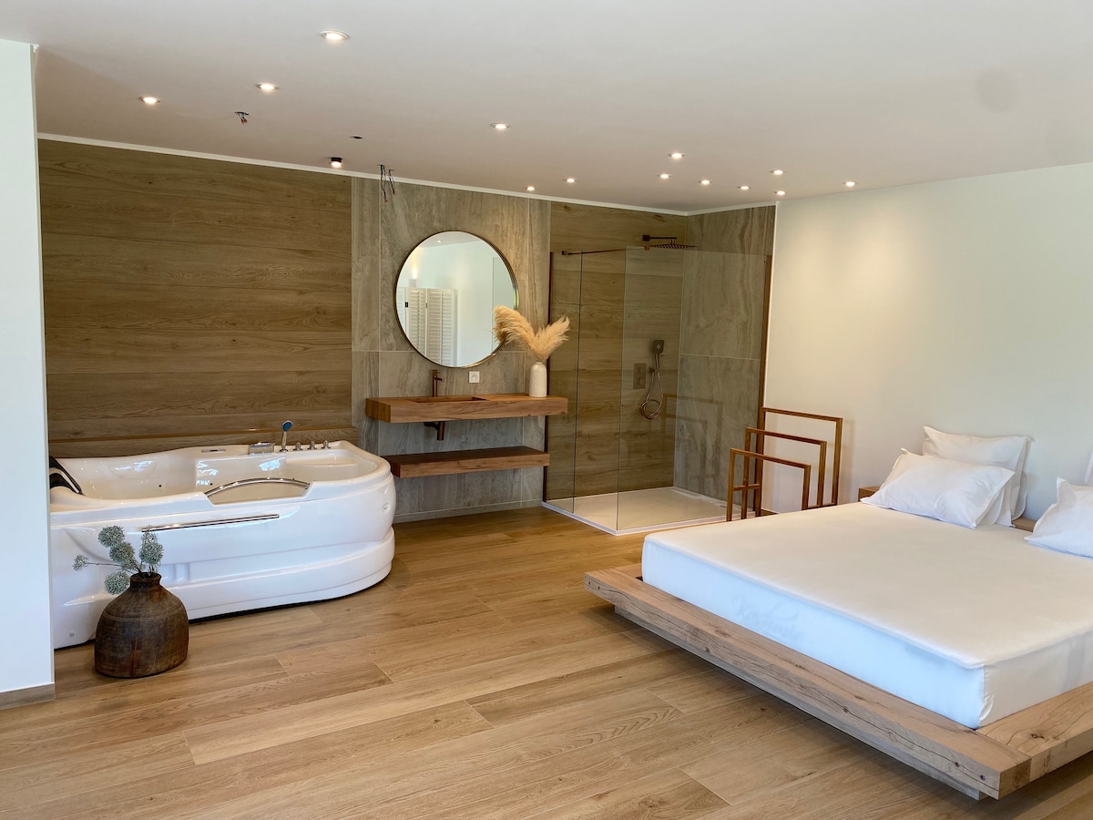 This bright and spacious apartment (85 m²) is located on the ground floor of a square stone farmhouse from 1809, set within a peaceful 15-hectare estate, far from the main road for a relaxing stay. Fully equipped kitchen, bright living and dining room, comfortable bedroom with en-suite bathroom (shower, sink, toilet). Separate toilet in the hallway. Private wood-fired sauna (additional charge). Private parking and EV charging station. Direct access to Lake Robertville through the private forest