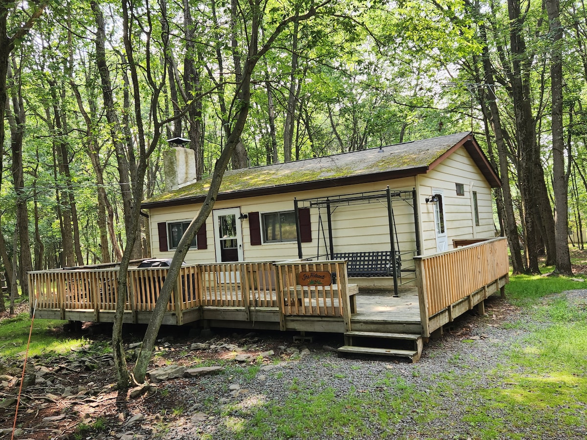 Vuelve a conectar con los demás y con la naturaleza en nuestra cabaña actualizada. * Cómoda y acogedora * Sala de masajes con aceites * Chimenea cálida y alfombra de piel de oso sintética * Dormitorio tamaño king * Jacuzzi * La decoración es una mejora opcional * El senderismo comienza en el escalón de la puerta * Cerca de muchas atracciones locales de Pocono. Ideal para una pareja, esta cabaña está enclavada en una pintoresca comunidad rodeada de bosque estatal. Estamos obligados a registrar a los huéspedes 48 horas antes de la llegada.