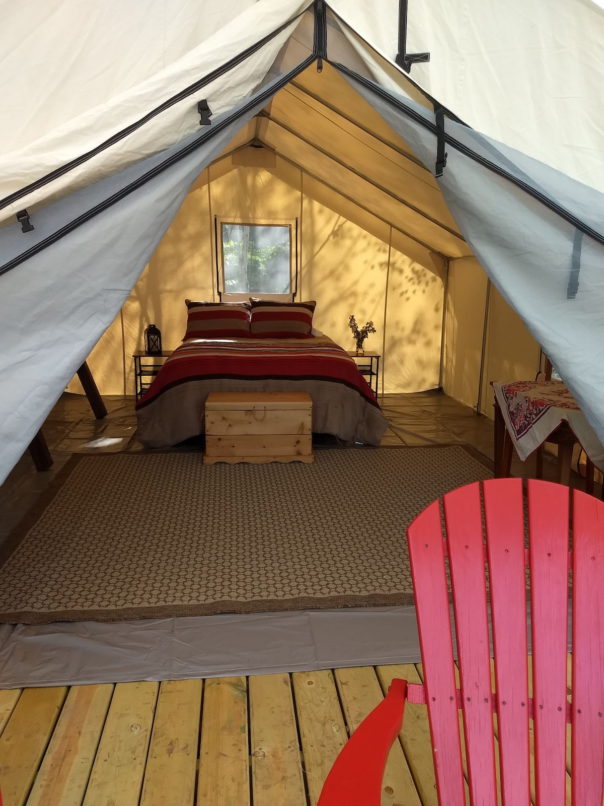 NATURE ELEVATED. ONE SEAMLESS STAY. EVERY RESORT AMENITY INCLUDED IN RATE. ONE PRICE = EVERYTHING. NO SURPRISE FEES--JUST GOOD TIMES. | Stay in Baby Face Nelson's Luxury Tent #14 at POV Lake Resort. Tent spaciously sleeps 4 with a full size futon and a queen bed. Stunning Northwoods view & short walk to easy lake access w/sandy beach. On site hiking trails, paddleboards, kayaks, canoes, game room, general store & stargazing. Boat rental & romance packages avail. No pets or hookups.