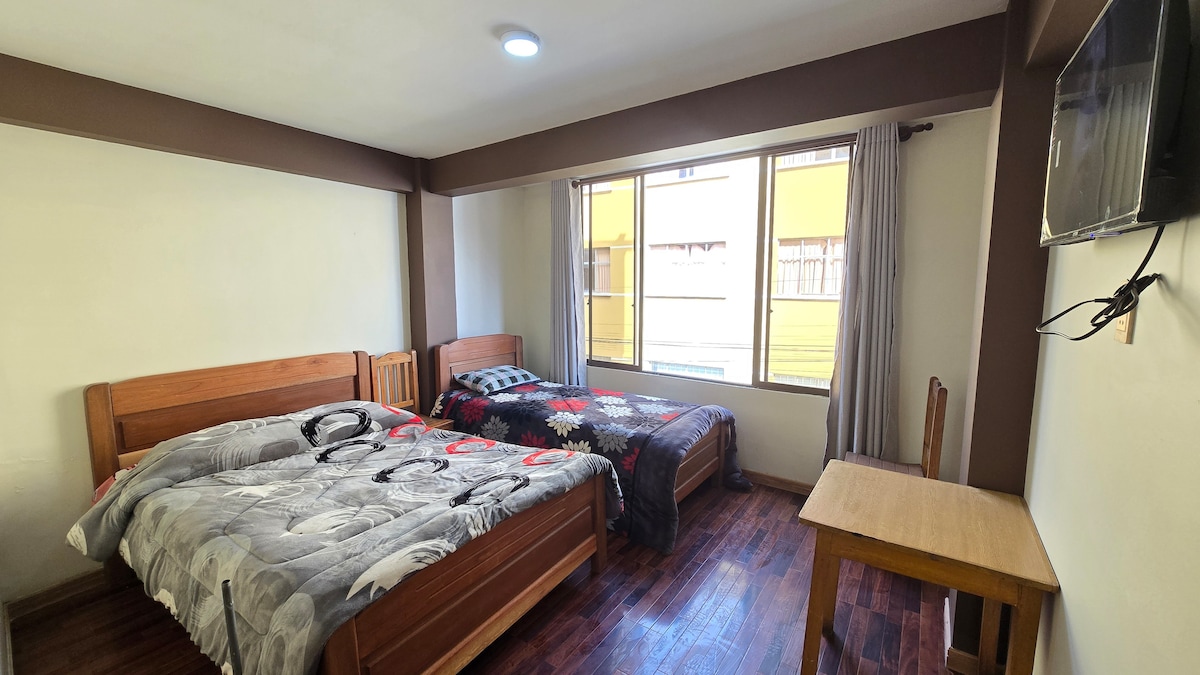 Habitación doble con dos camas de plaza y media, baño privado, WI-FI en todo el edificio, TV Smart con YouTube conexión a internet