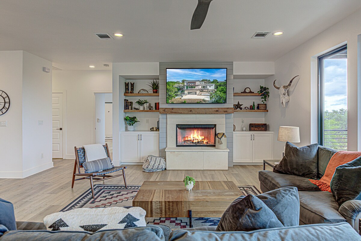 * Casa en Deep Water Lake * ¡Te damos la bienvenida a GetawayTX Lake Travis Treehouse! Impresionante y elegante casa frente al lago enclavada en más de un acre de árboles. Los servicios de alta calidad incluyen mostradores de piedra y electrodomésticos de primera calidad. ¡Horno de pizza nuevo! Parrillas al aire libre: ¡Traeger, Big Green Egg y propano! Relájate en la piscina de agua salada y en el jacuzzi (con luces multicolores) y disfruta viendo cómo se pone el sol sobre el lago. Trae también tu barco, moto acuática y cañas de pescar... ¡tendrás tu propio muelle privado!