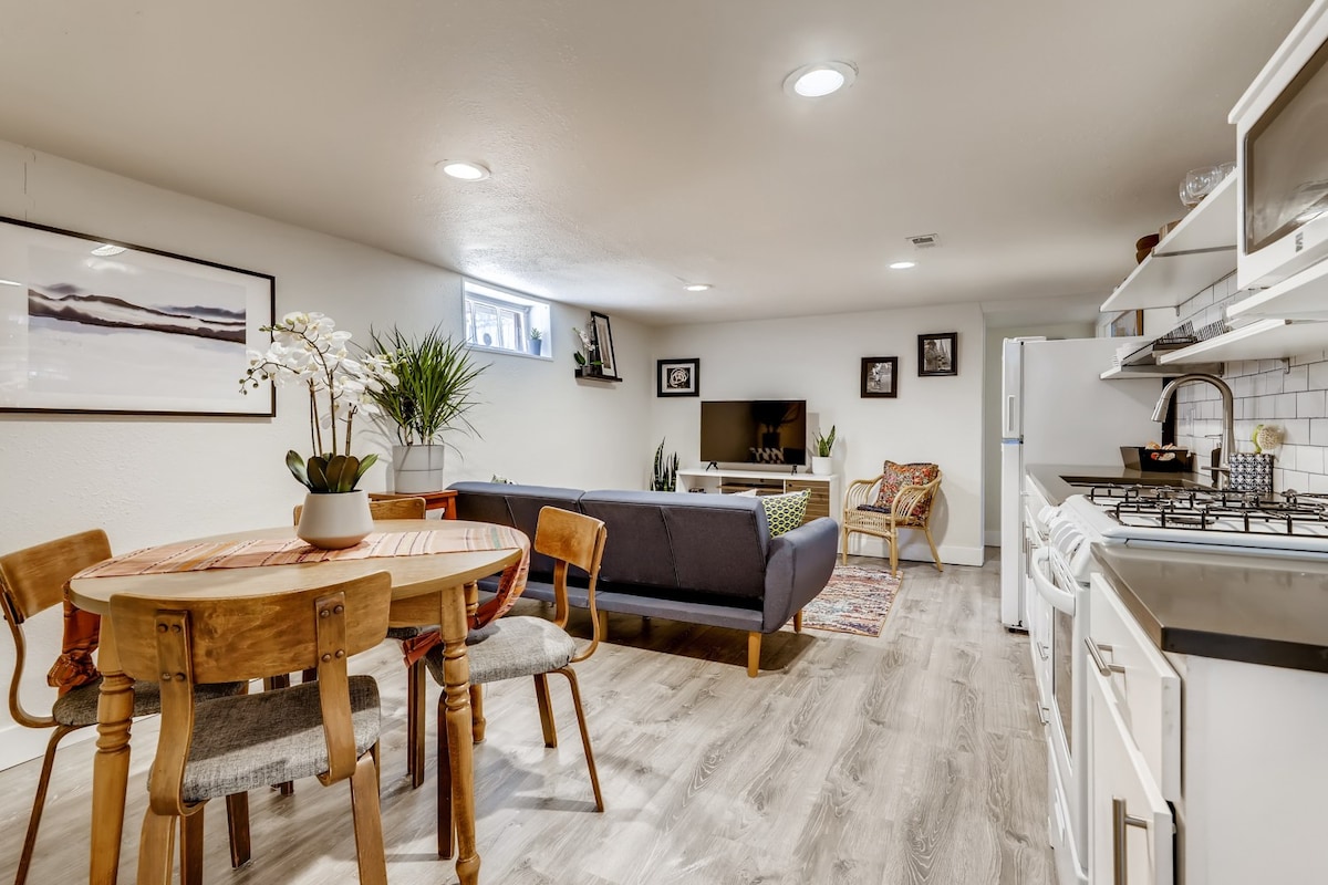 Escape to a private, newly renovated garden-level suite with your own fenced backyard and entrance — perfect for couples, remote workers, and dog lovers. Just minutes from I-70, enjoy easy access to Denver, Golden, and the mountains while relaxing in a quiet, cozy space designed for comfort and privacy. • Private entrance + fully fenced yard • Fully stocked kitchen • In-unit washer + dryer • 55” Smart TV • Dedicated workspace • Gigabit Wi-Fi • Free on-site parking