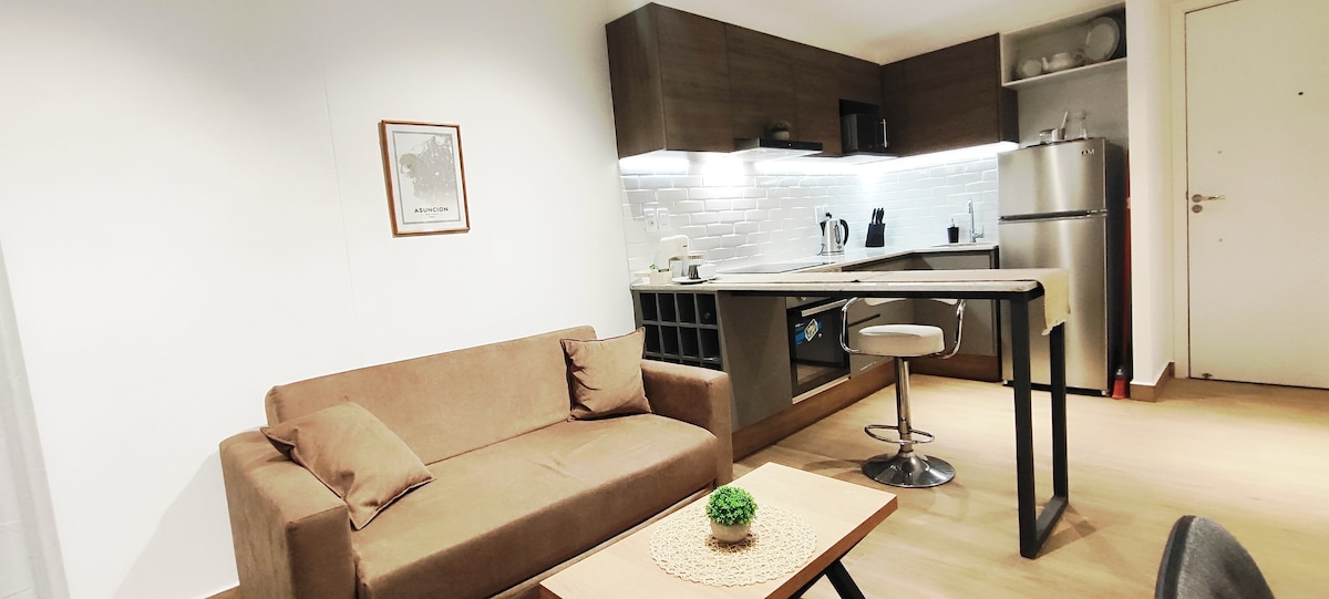 Beautiful cozy condo ready for you to enjoy your stay in Asuncion for a few days, or a few months. Everything you need is included. Short walk to Shopping Villa Morra/Mariscal, supermarket, and many restaurants. Use of roof top pool, BBQ and gym. Large balcony with great view. Wifi, linens, kitchen and everything to make yourself feel at home.