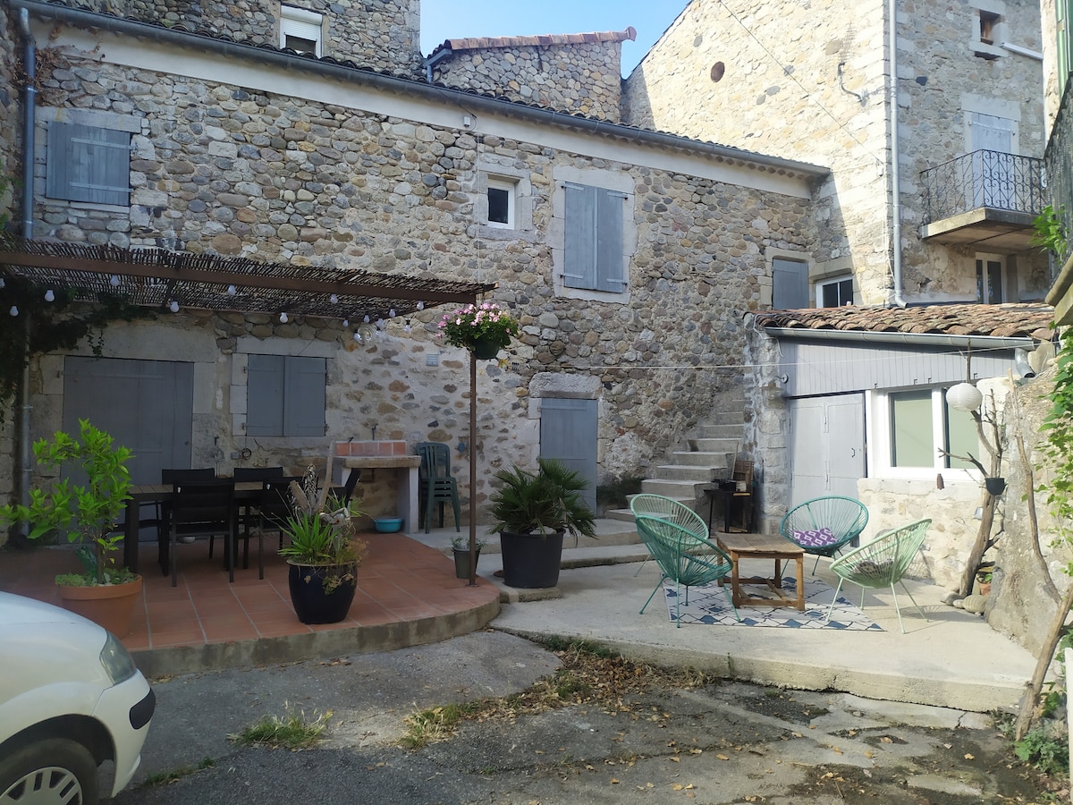 Au coeur de Lanas, charmant petit village ardéchois, venez découvrir notre studio très "cocoon" et atypique, à proximité de l'Ardèche. Le logement est fonctionnel et idéal pour 2 personnes. 😍 De plain pied, il a une entrée indépendante sur une cour fermée (utile si vous avez des vélos)... L'appartement se compose d'un coin cuisine/repas très bien équipé et une chambre séparée, avec 1 lit confort (160×200cm) +1 petit bureau. Il est ouvert sur une belle terrasse couverte... pour le farniente🌞😎
